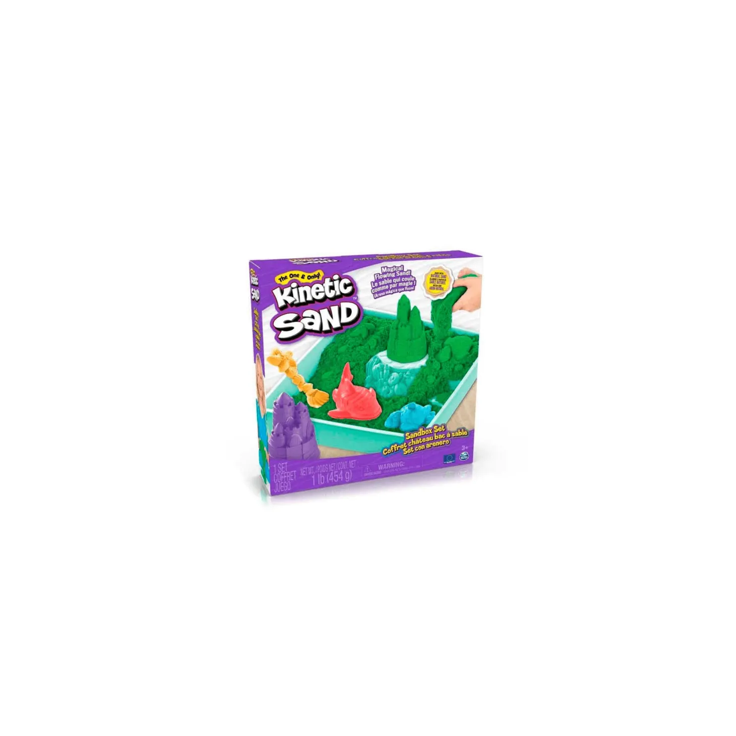 Contiene: 454 g de arena Kinetic, 3 moldes de arena (tortuga, tiburón y castillo), 1 multiherramienta, 1 bandeja e instrucciones.