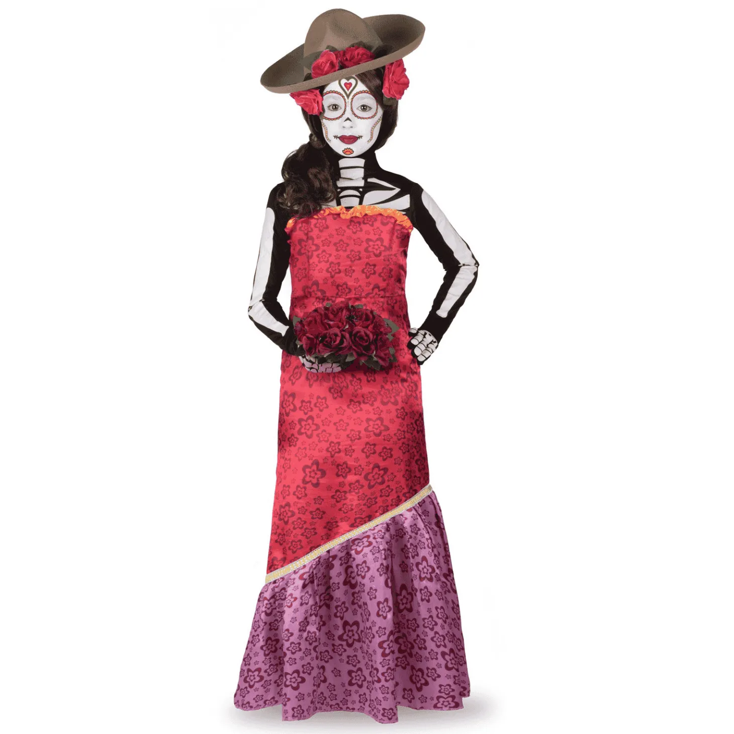 ¿Qué incluye? incluye camiseta esqueleto, guantes, vestido, sombrero, peluca, 2 flores, 2 sets de tattoos, esponja y maquillaje blanco.