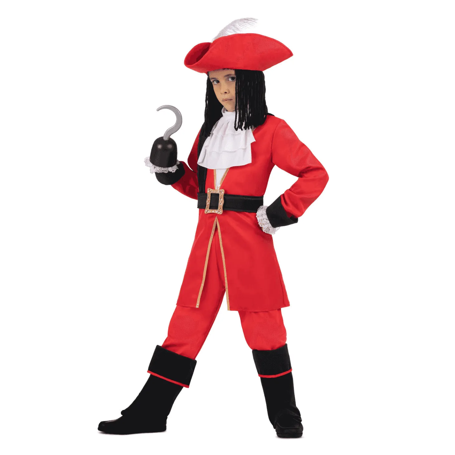 ¿Qué incluye? incluye sombrero con peluca textil, chaqueta, cuello, garfio, pantalón, cinturón y polainas.