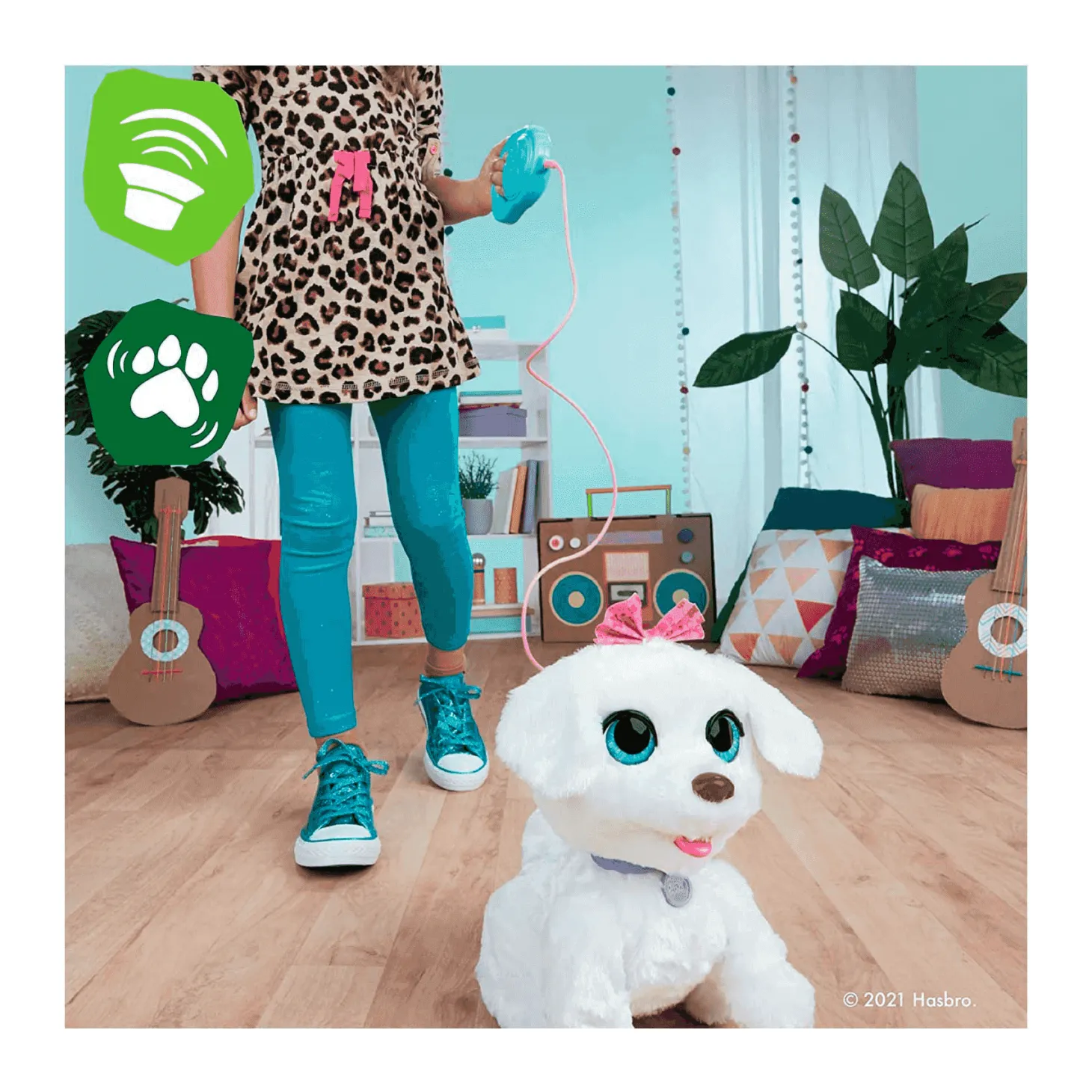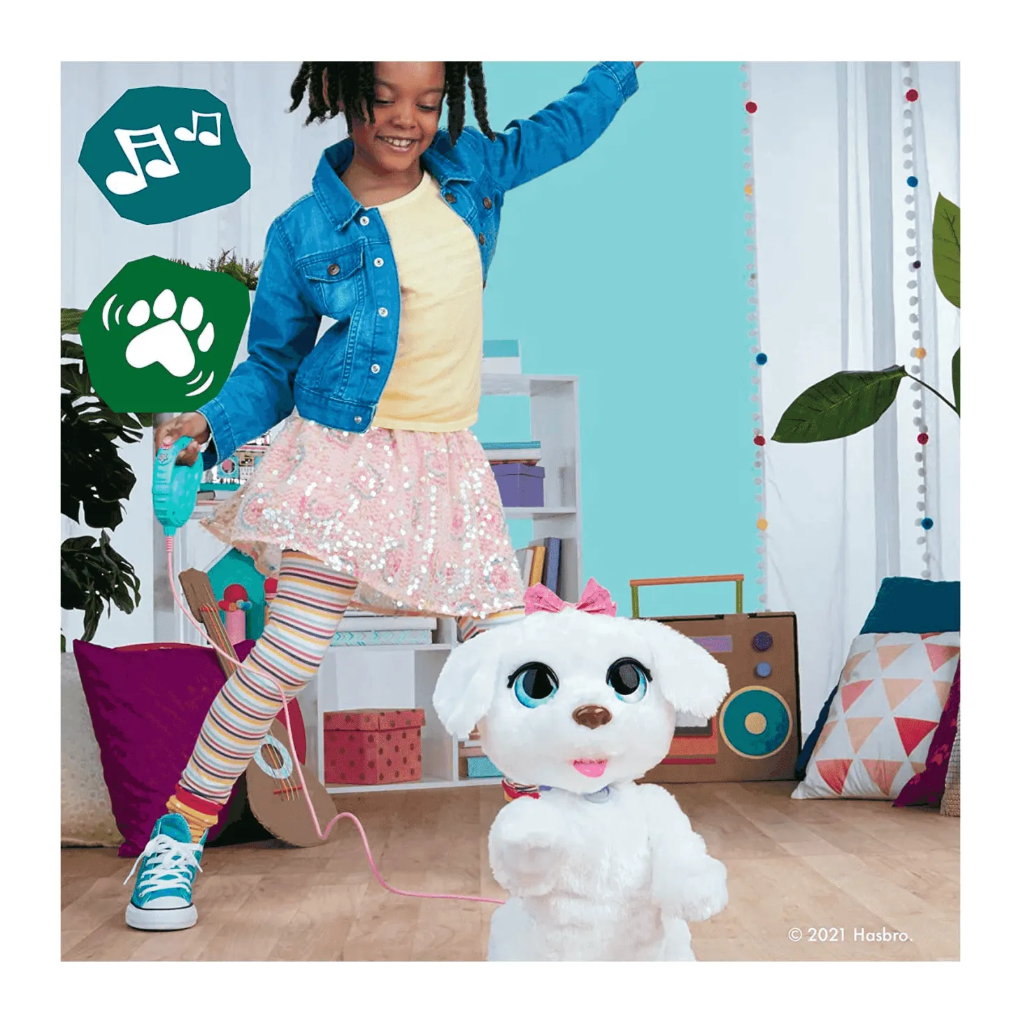 Se trata de un perrito blanco de peluche interactivo con bonitos ojos azules que tiene talento para bailar varios ritmos con sus singulares movimientos. Es un regalo para niños/as muy especial, de la reconocida marca Hasbro, que les brinda compañía y momentos alegres a través de sus expresiones, muy parecidas a las de un cachorro real.
