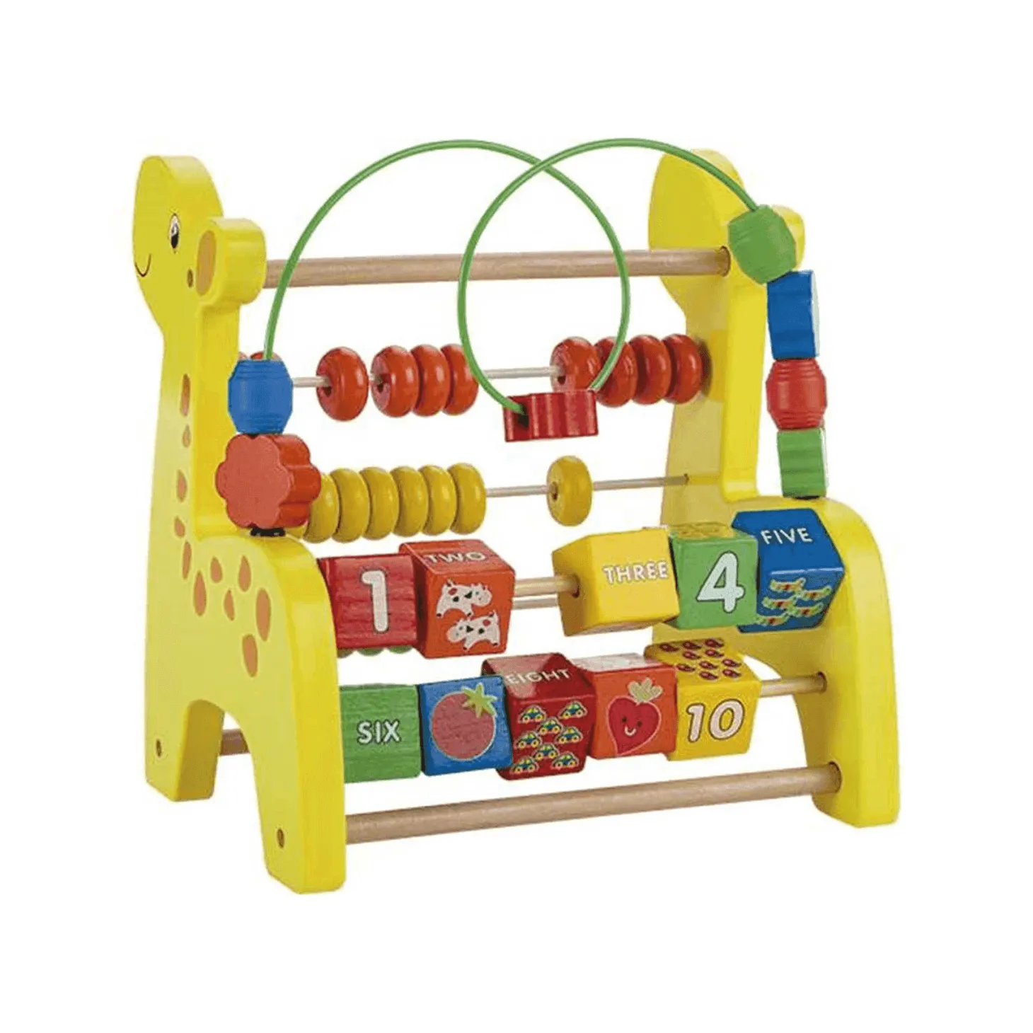 Divertida jirafa de madera, de alegres colores y con 3 actividades educativas. Tu bebé ejercitará su capacidad manual deslizando las cuentas por el laberinto, moviendo las piezas del ábaco, mientras se inicia el aprendizaje de los números con sus vistosos bloques de divertidos diseños.