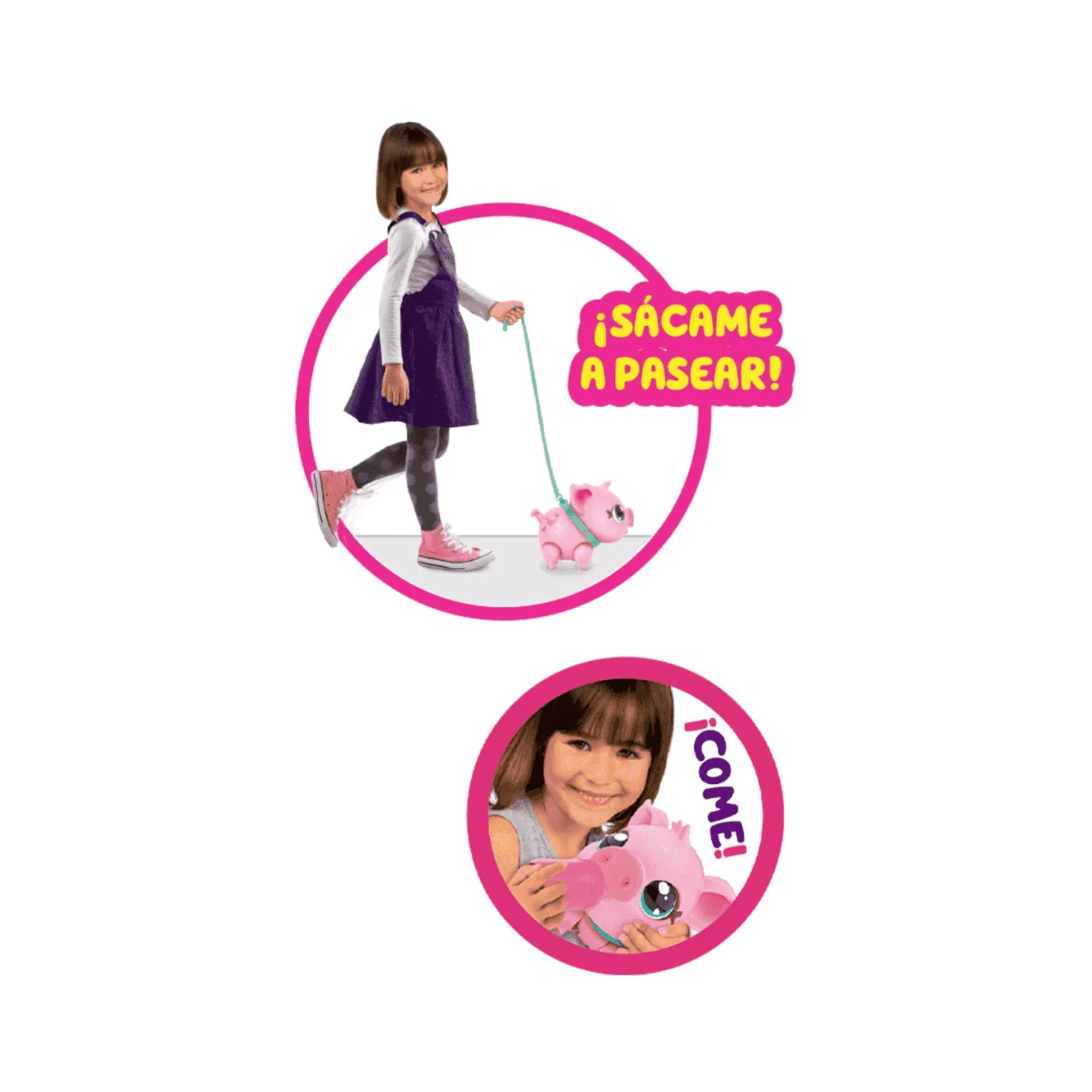 El Little Live Pets My Little Pig Pet es un cerdito que camina y emite música. Si se detiene, lo puedes acariciar y reanudará la marcha. Emite más de 25 sonidos y reacciones diferentes con las que se divertirán. Sus orejas y colita son suaves y elásticas.