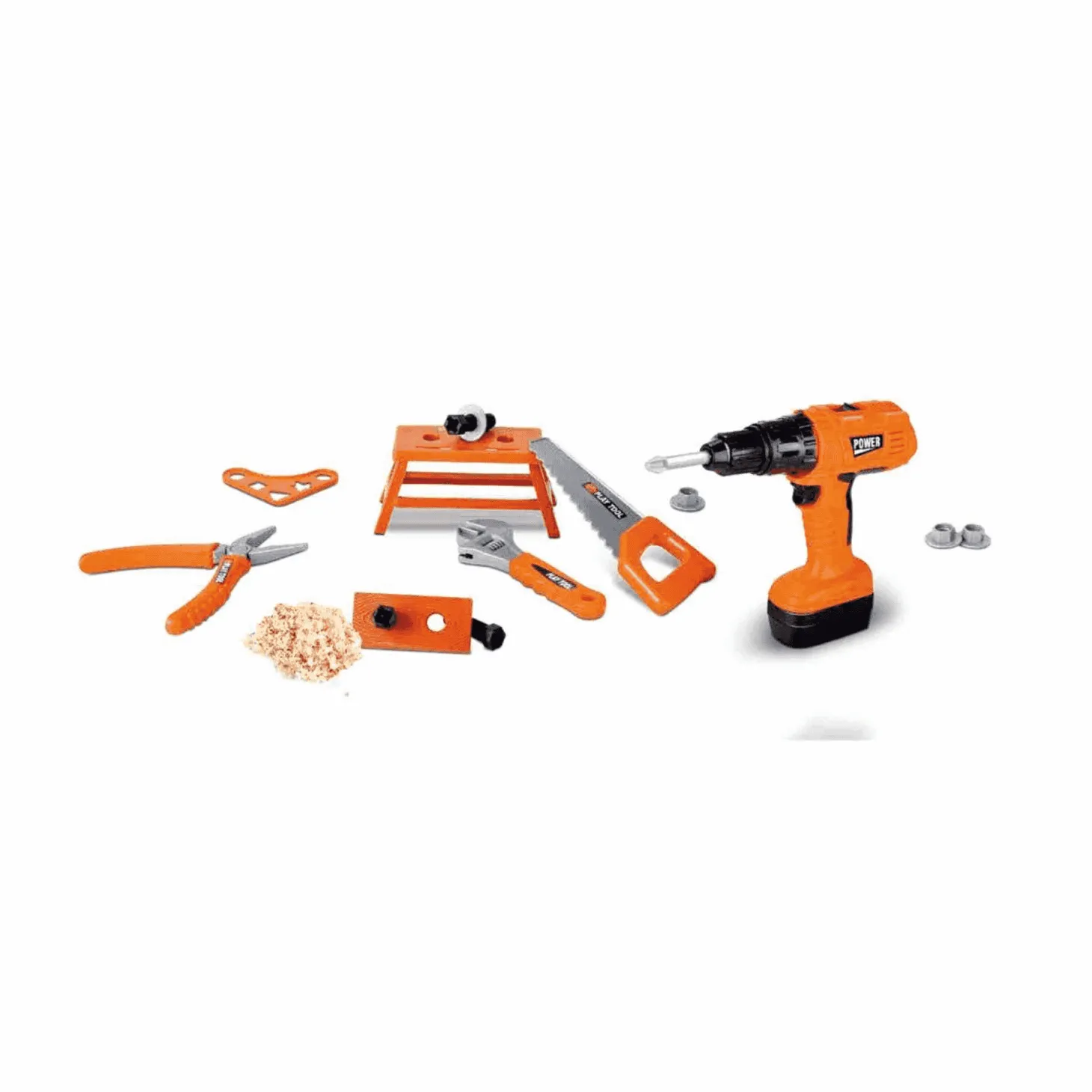 El set cuenta con una variedad de herramientas que incluyen un martillo, taladro, alicates, serrucho y otros accesorios de construcción que harán que los niños se sientan como auténticos carpinteros o constructores.