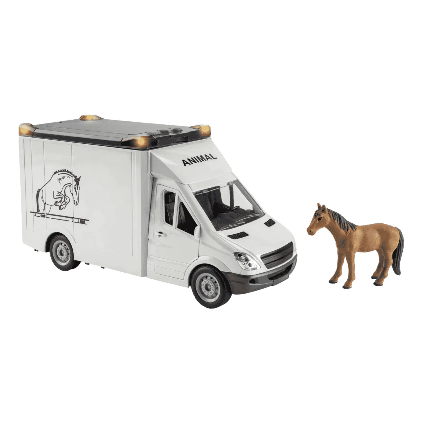 ¡Siempre a punto para actuar! Con este camión transporte de caballos podrás imaginar mil historias. Funciona a fricción. ¡Con luz y sonidos! Medidas aproximadas: 20 cm. Edad recomendada: + 3 años. ADVERTENCIA: No recomendable para menores de 3 años, ya que contiene piezas pequeñas que podrían provocar asfixia en caso de ser ingeridas por el niño/a.