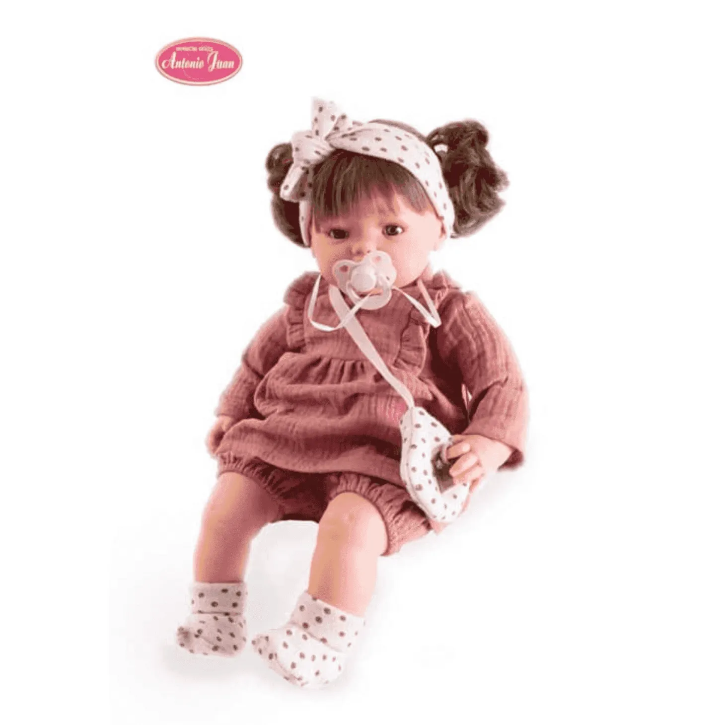 Además, Beni es una muñeca de Antonio Juan con mecanismo de sonido. Si le quitas el chupete, comenzará a llorar y llamar a sus papás, pero cuando se lo pongas de nuevo, se calmará al instante.