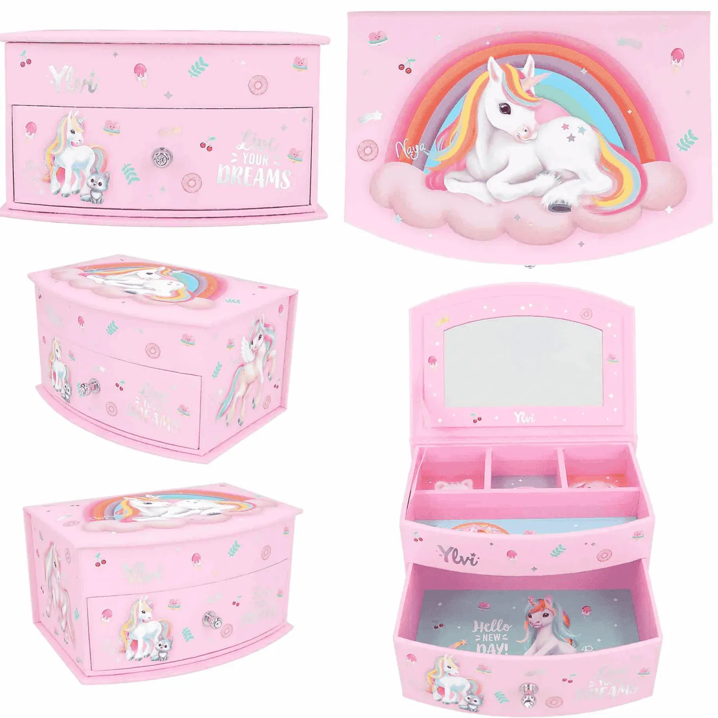 Para guardar las joyas más preciadas y todo tipo de tesoros. Este joyerito rosa de Ylvi está decorado con preciosos unicornios y otros animalitos amigos suyos. La tapa abatible lleva integrado un espejo en el interior y el tirador del cajoncito es un brillante. marrón claro con brillo labial color melocotón y aroma a melocotón; oso rosa con brillo labial rosa y aroma a fresa. (Contenido de cada labial: 3 ml). transparente con práctico cierre de clip. Instrucciones ilustradas incluidas. por 100. Material: poliéster reciclado 100 por 100. de instrucciones de uso.