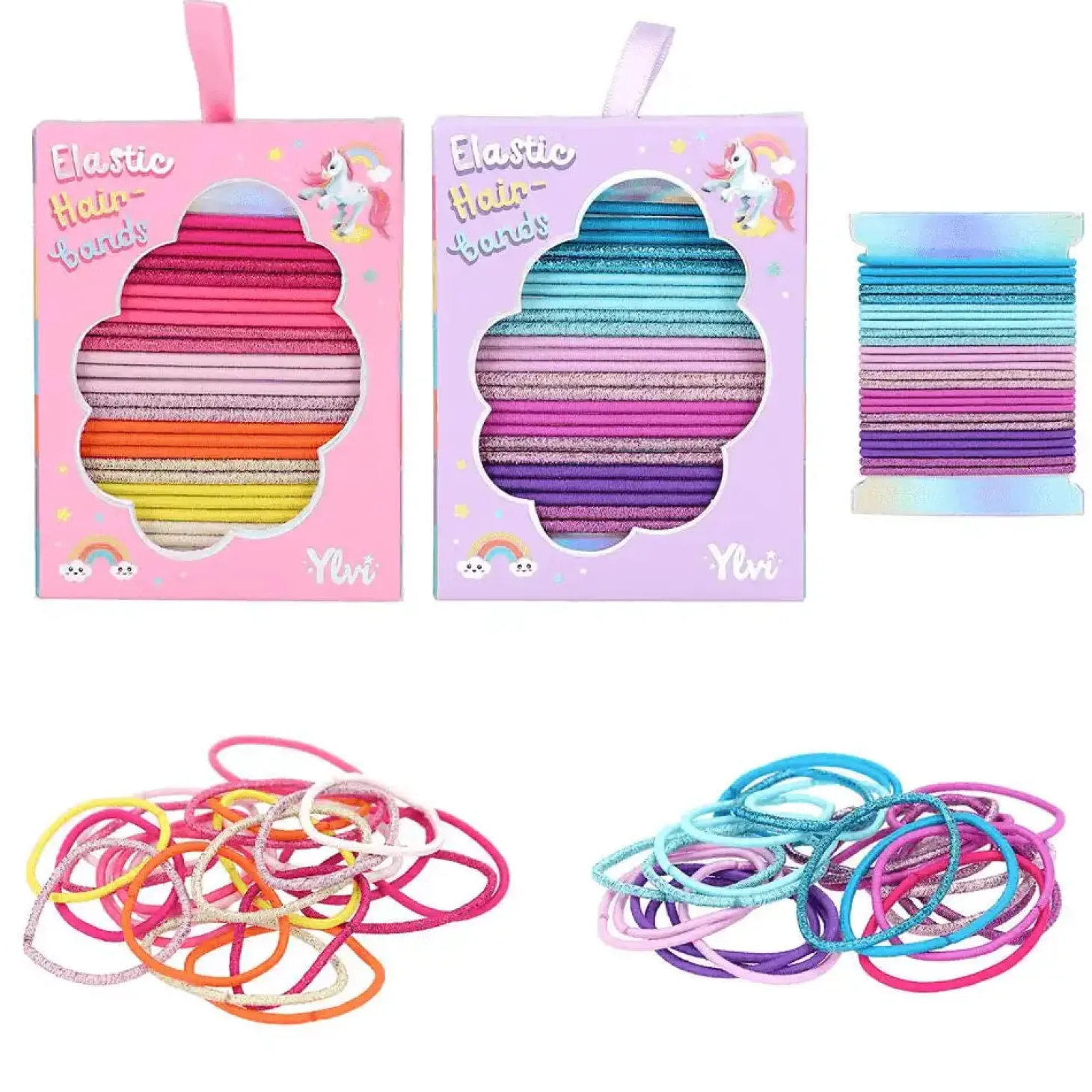 Descripción del producto: ¡Qué cantidad de preciosas gomas para el pelo! 25 gomas para el pelo finas, elásticas y algunas con purpurina. Uno de los sets contiene gomas de colores en distintas gamas de rosa, amarillo, dorado y blanco. El otro set conjunto con diferentes tonos de azul y morado. De Ylvi.