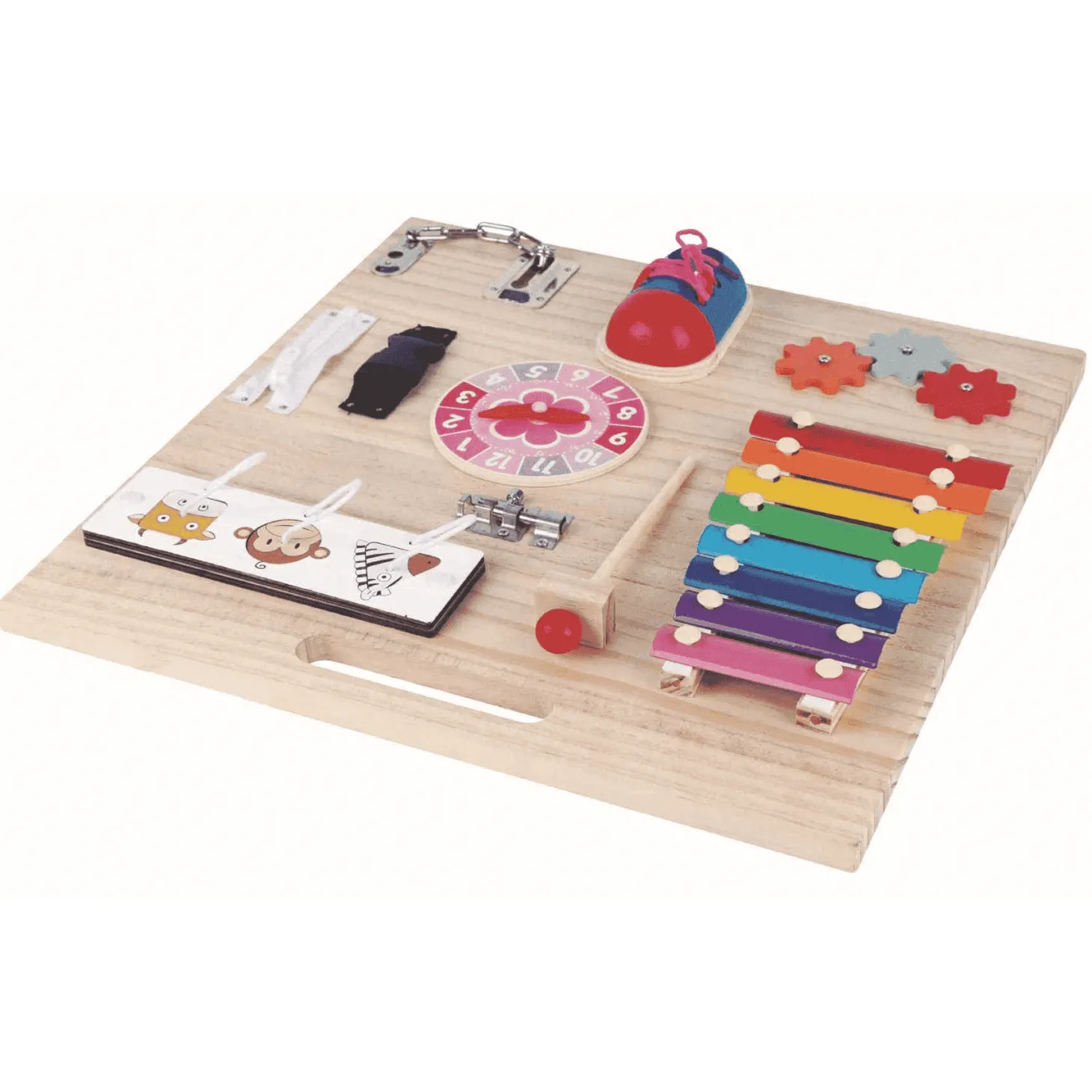 Como un juguete Montessori de madera, este tablero fomenta un aprendizaje interactivo y estimulante para los más pequeños.