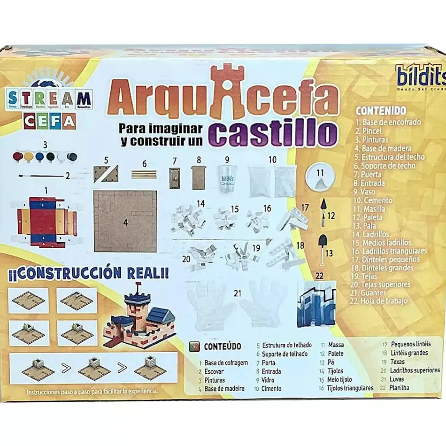 Este kit incluye miniladrillos, cemento, herramientas de construcción y una guía ilustrada que enseña cómo montar cada sección del castillo paso a paso. Con él ellos pueden aprender técnicas reales de construcción como encofrado, colocación de ladrillos, estructura de tejado y decoración final.