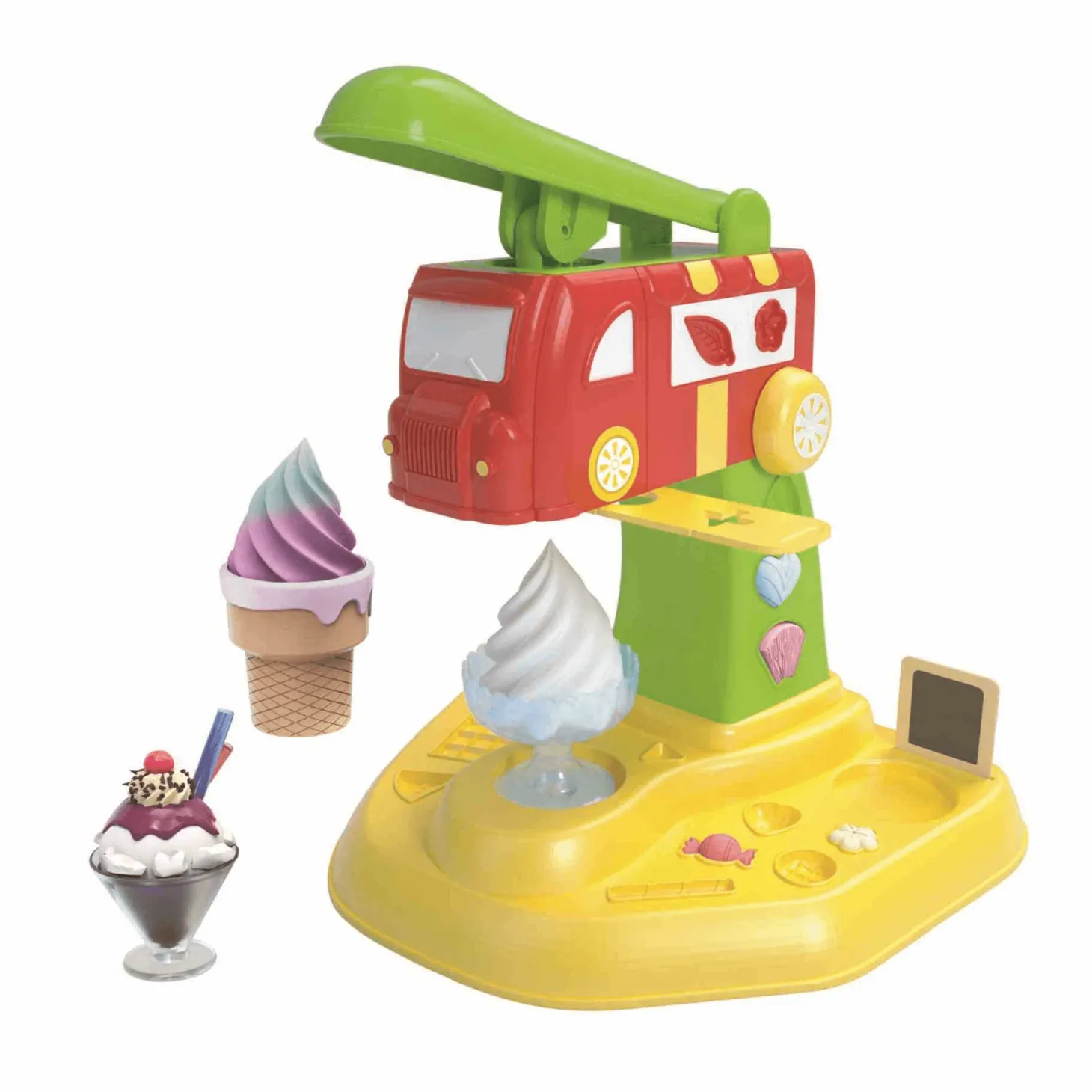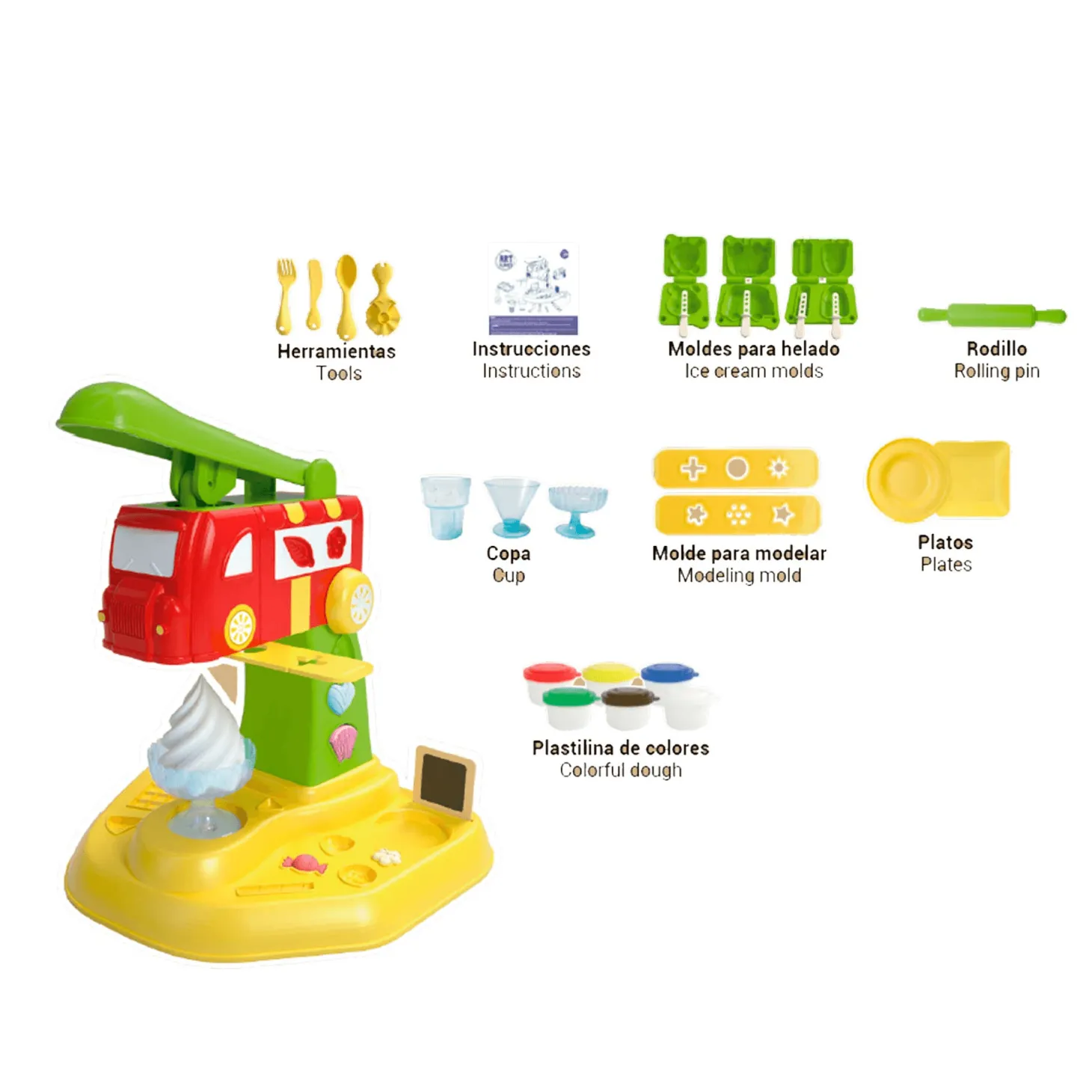 - Máquina de Helados con Accesorios Completo: Incluye una divertida máquina para crear helados de plastilina, con moldes de conos, copas y cubetas, además de herramientas para añadir toppings y decorar cada creación.