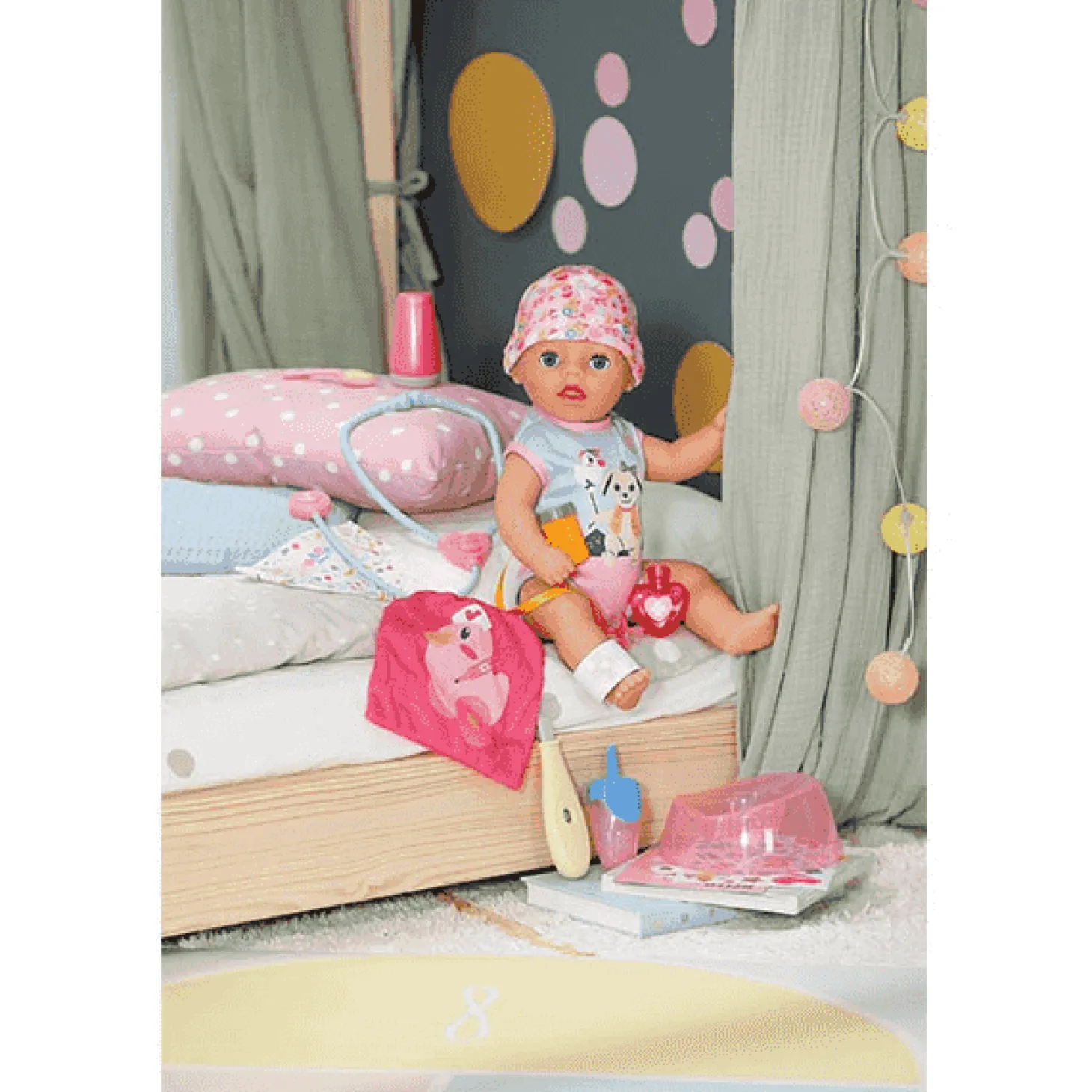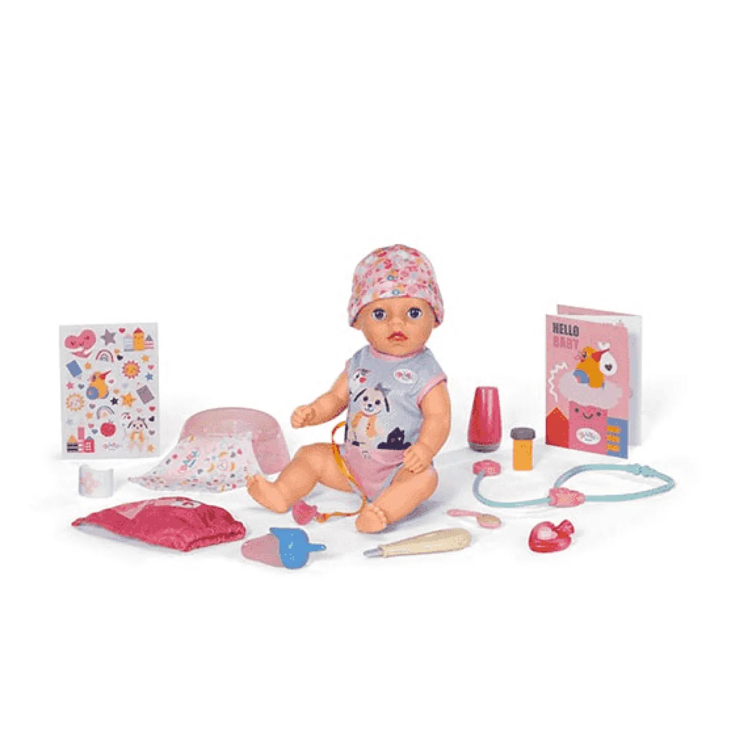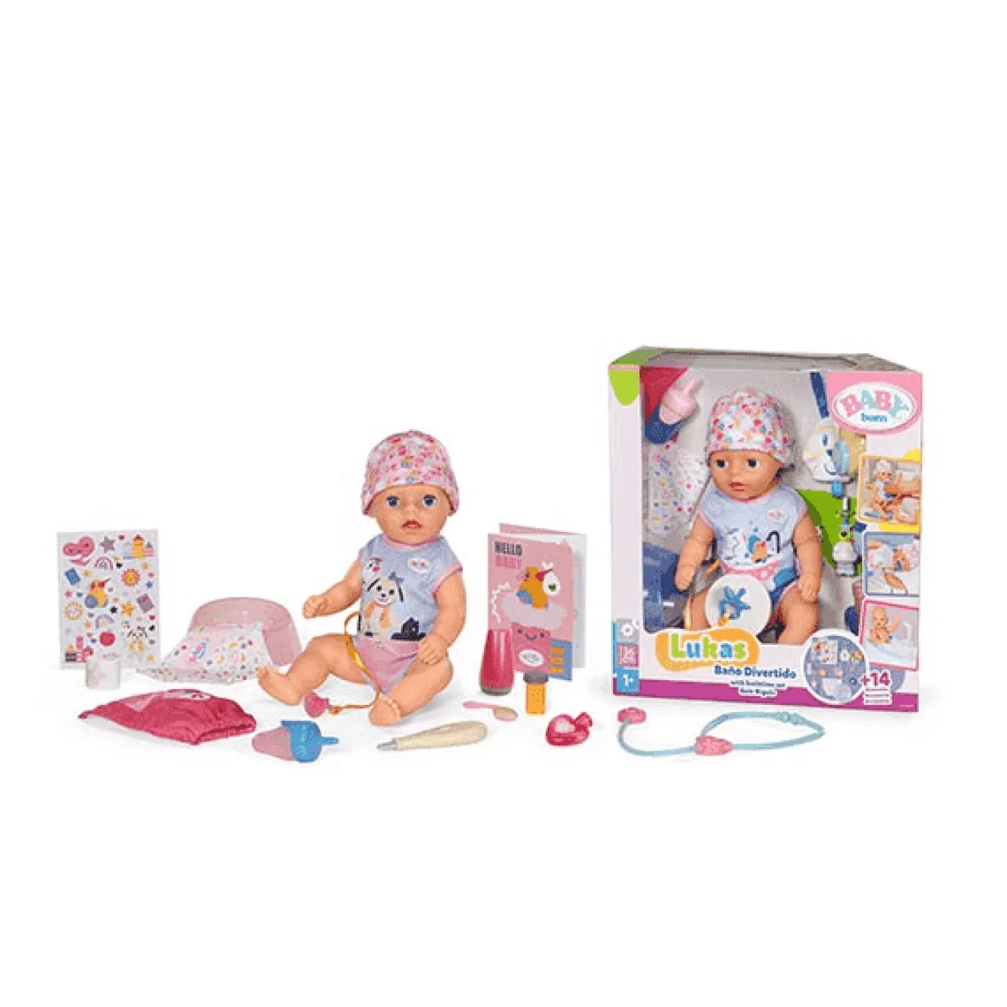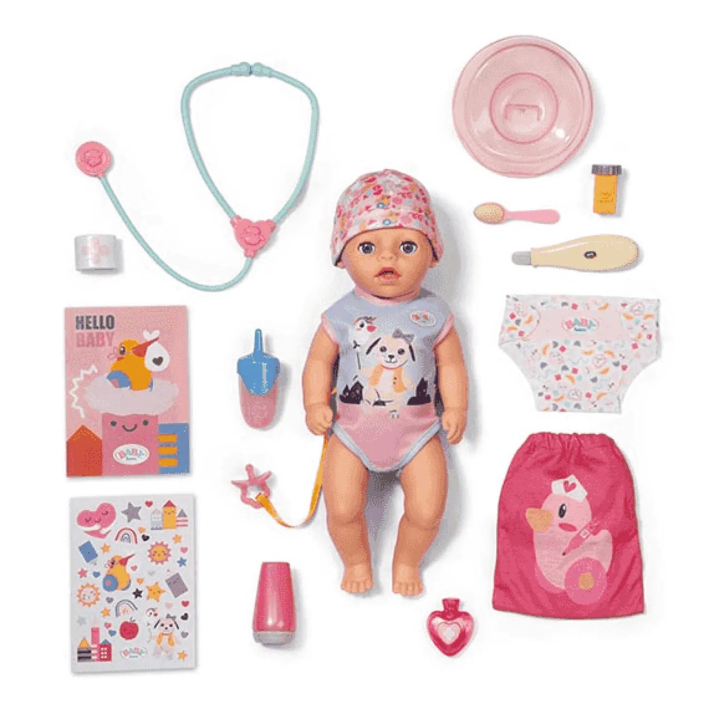 Incluye 13 accesorios que permiten recrear distintas escenas de cuidado: biberón, pañales, orinal, ropa, certificado de nacimiento y más. :contentReference[oaicite:1]{index=1}