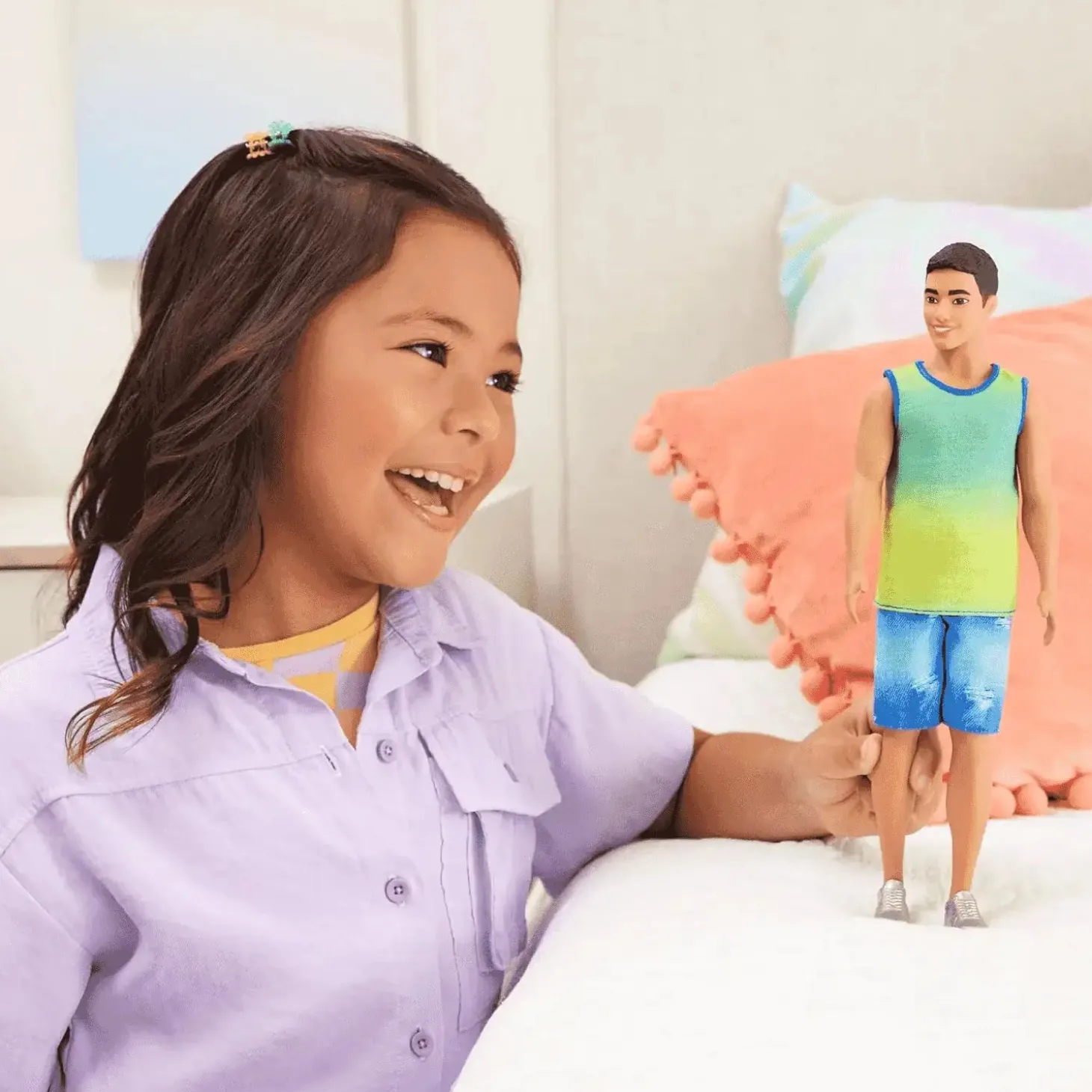 - Este muñeco Ken tiene un tipo de cuerpo ancho y lleva una camiseta de tirantes con degradado azul y verde que hace que su personalidad destaque.