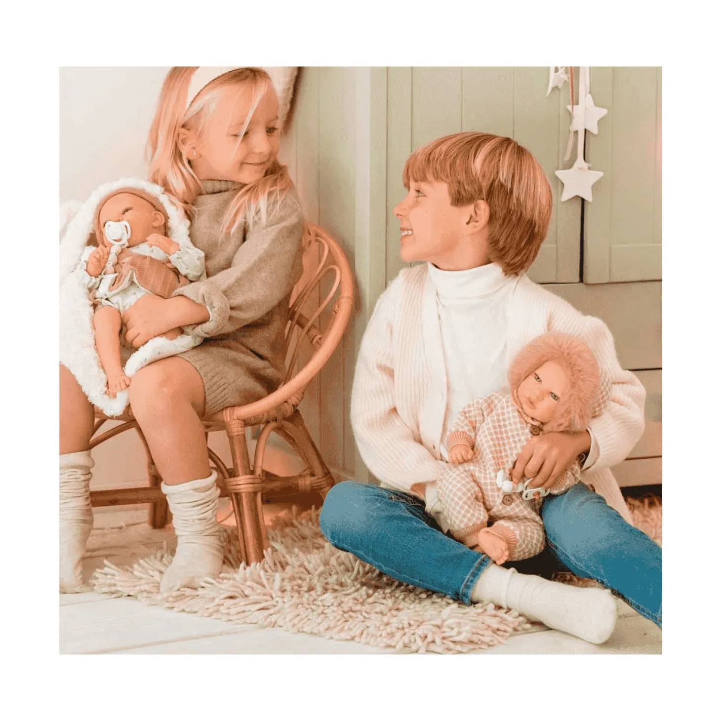Bebé reborn de 40 cm MANUELA. Bebé realista con cuerpo y extremidades de vinyl con ropita de lana y pelo en tonos maquillaje. Viene acompañada de bolso y cojín de borreguito. Incluye chupete, chupetero, pañal, libro de familia y certificado de autenticidad.