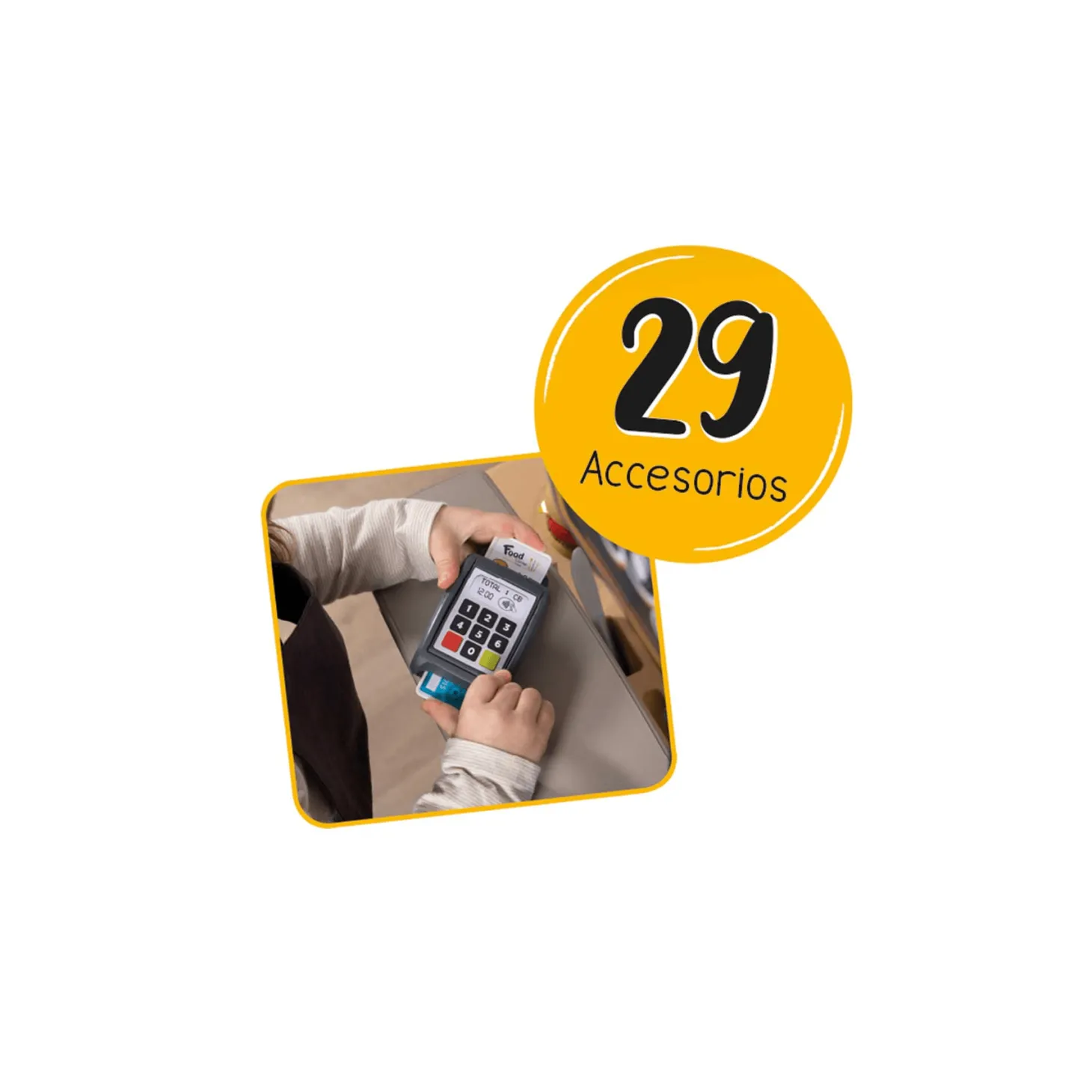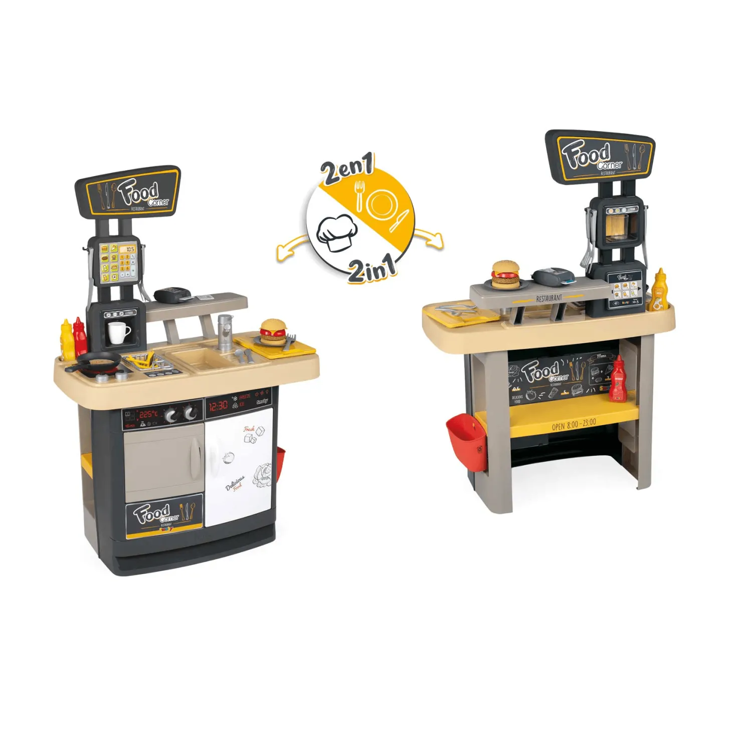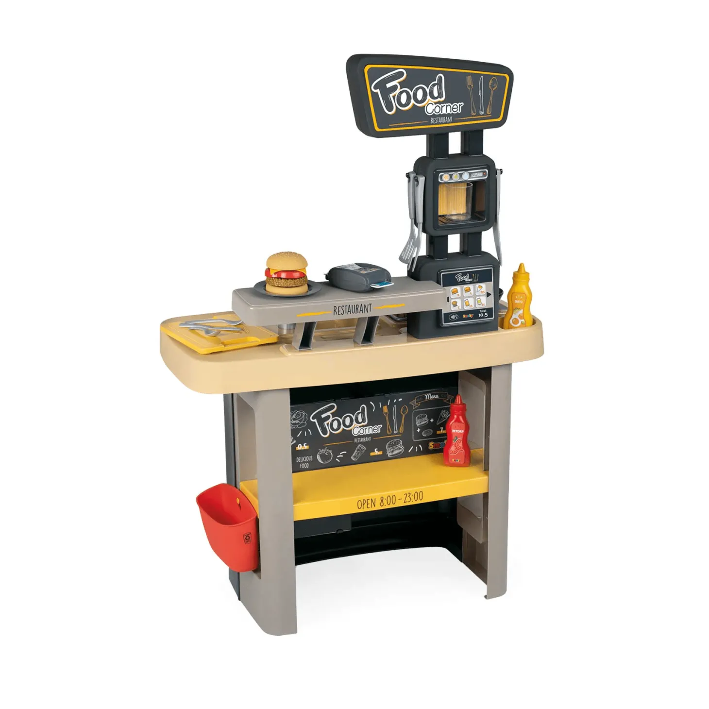 Food Corner Restaurante es un increíble juguete 2 en 1 que incluye una hermosa cocina para que tu hijo o hija puedan recrear todos los platos que quieran. Tiene también un área para los clientes con una caja registradora. Permite a los niños y niñas interactuar unos con otros. Podrán pedir comida, prepararla, pagar y jugar a estar en un restaurante. Todo gracias a sus múltiples accesorios de gran detalle, como utensilios de cocina y distintos alimentos. Tus hijos podrán pasar horas de diversión en este maravilloso módulo mientras estimulan su imaginación y aprenden. Es el mejor regalo para niños y niñas de 3 a 6 años. Aprenderán al mismo tiempo que imaginan una infinitud de posibilidades de juego.