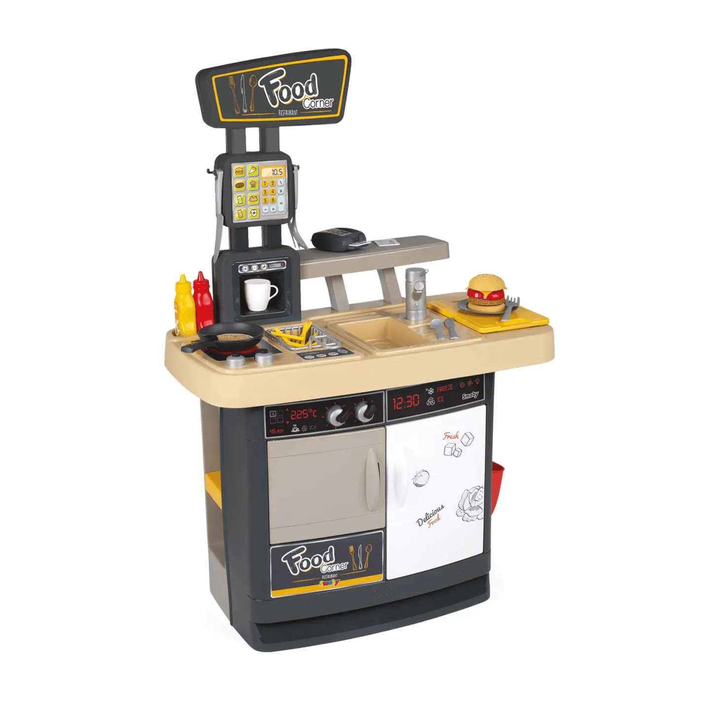 Incluye un módulo de 63 x 95,50 x 38,80 cm que tiene una cocina de juguete integrada con fogones, freidora, una cafetera, un horno y un frigorífico. Por el otro lado, tiene un área para los clientes que incluye el menú, el terminal de pedidos falso, el dispensador de bebidas falso y una bandeja de salida y retorno para pedir. También incluye 29 accesorios de distintos tamaños. Los accesorios no tienen sonido ni luces.