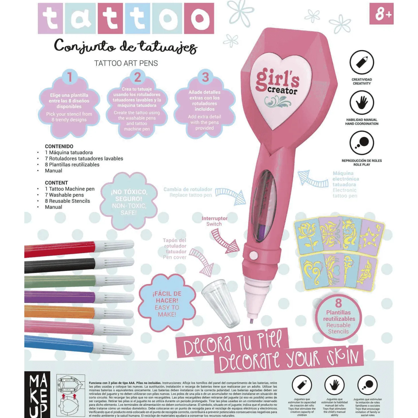Y lo mejor de todo, nuestro Conjunto de Tatuajes es seguro y no tóxico, perfecto para niños y adultos por igual. Así que puedes divertirte sin preocupaciones.