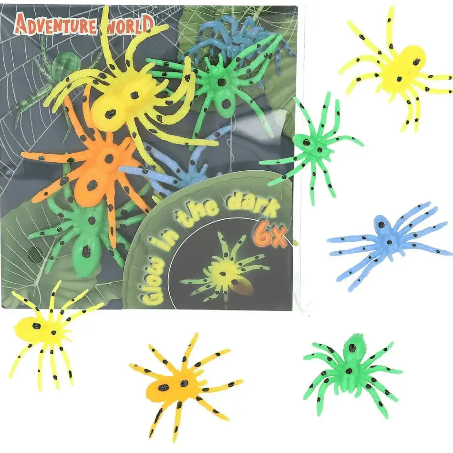 Descripción del producto: ¡Atención, arañas! Estas chulísimas arañas de plástico son muy guay y, además, se ilumien la oscuridad. El set se compone de 6 arañas: amarillo, naranja, azul y verde (al menos una araña de cada color). De Adventure World.