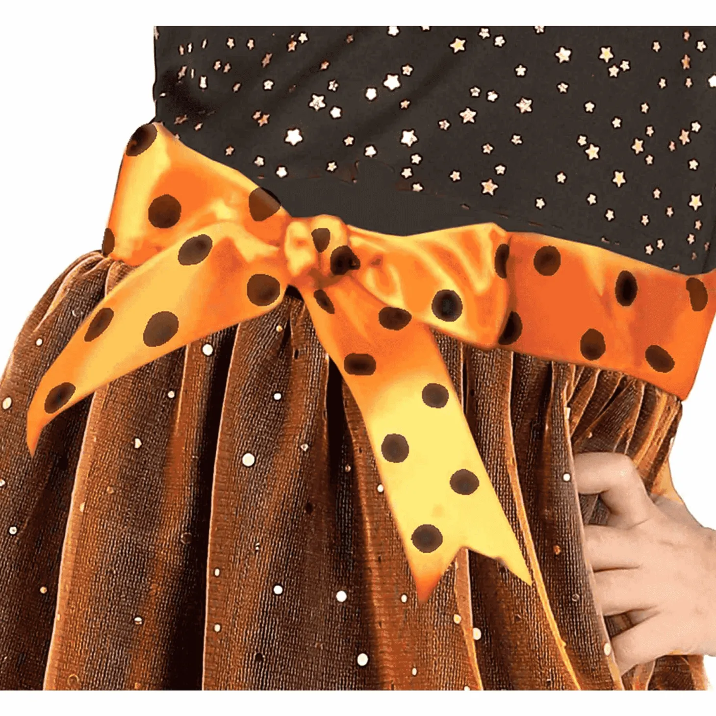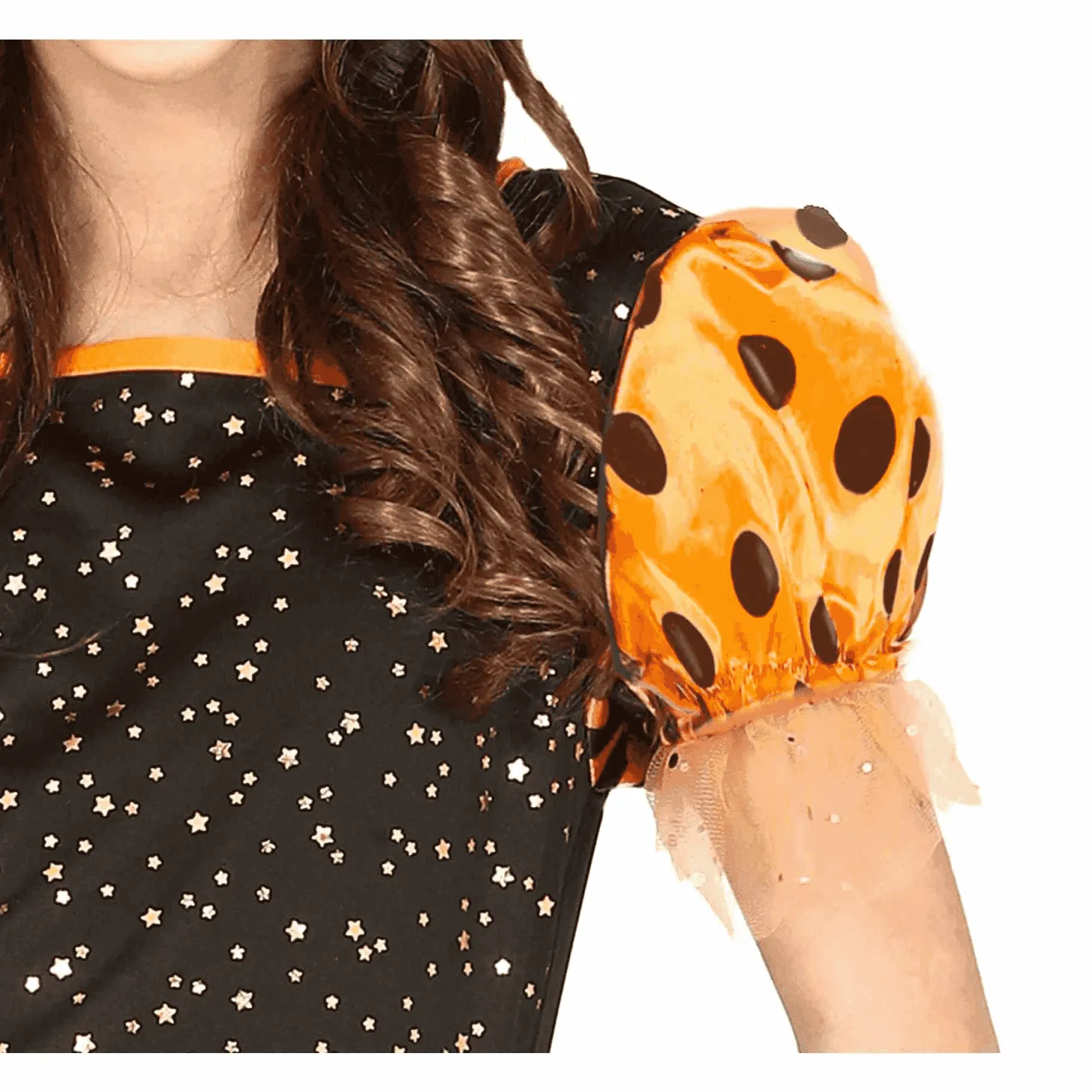 El Disfraz de Brujita con Mangas de Lunares es perfecto para niñas de 5 a 6 años. Incluye un vestido en tonos morados y negros, adornado con lunares en las mangas y una falda de tul brillante. También cuenta con un sombrero puntiagudo que complementa el look de bruja clásica. El material es suave y cómodo, ideal para que las niñas disfruten de la fiesta sin molestias.