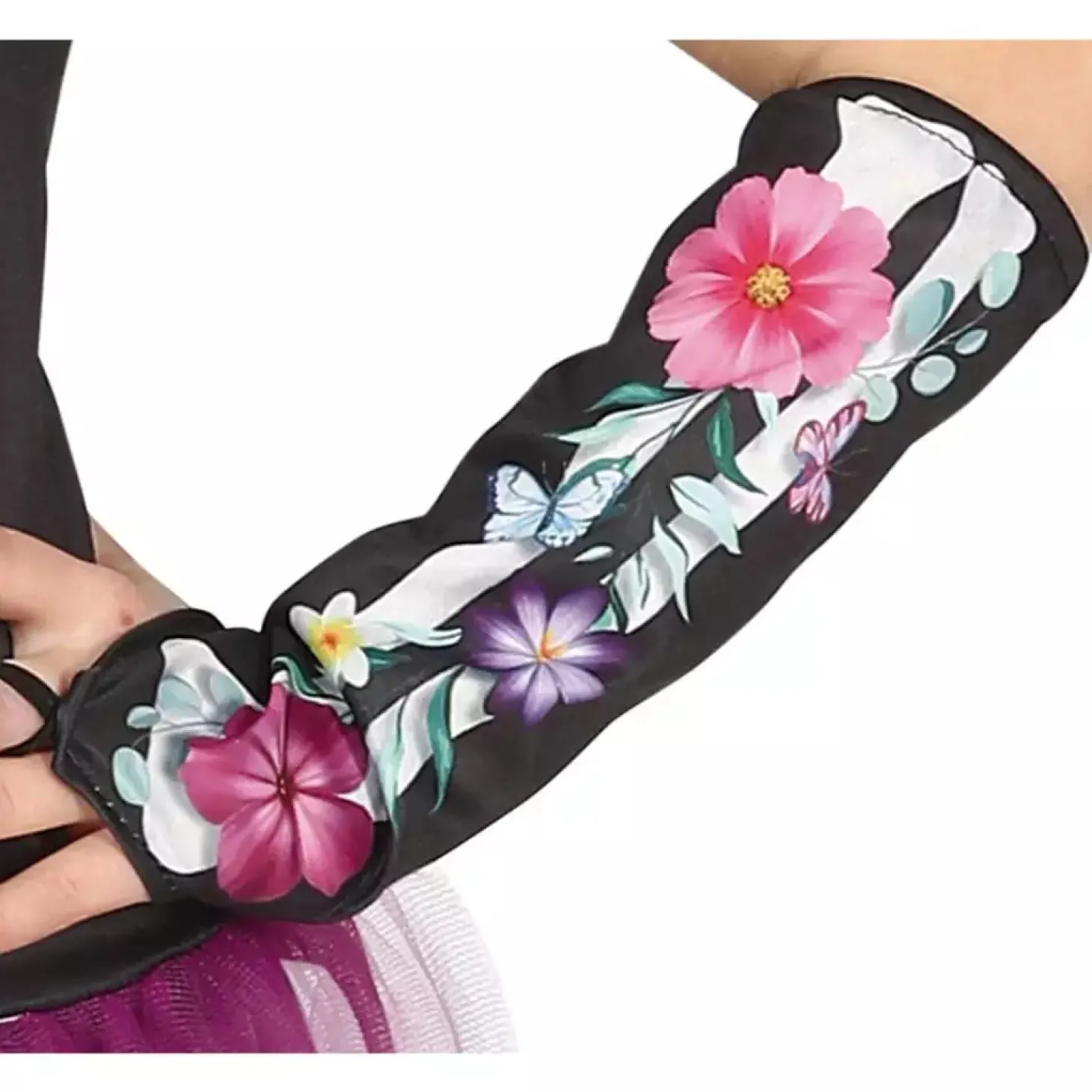 - Pantalón con diseño esquelético decorado con flores de colores.