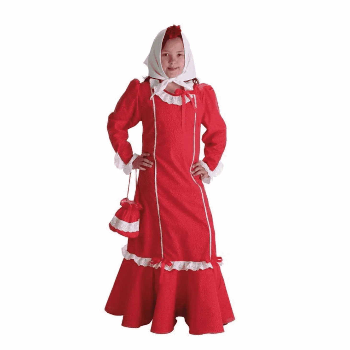 - Incluye vestido tradicional de lujo, pañuelo para la cabeza y bolsito rojo a juego.