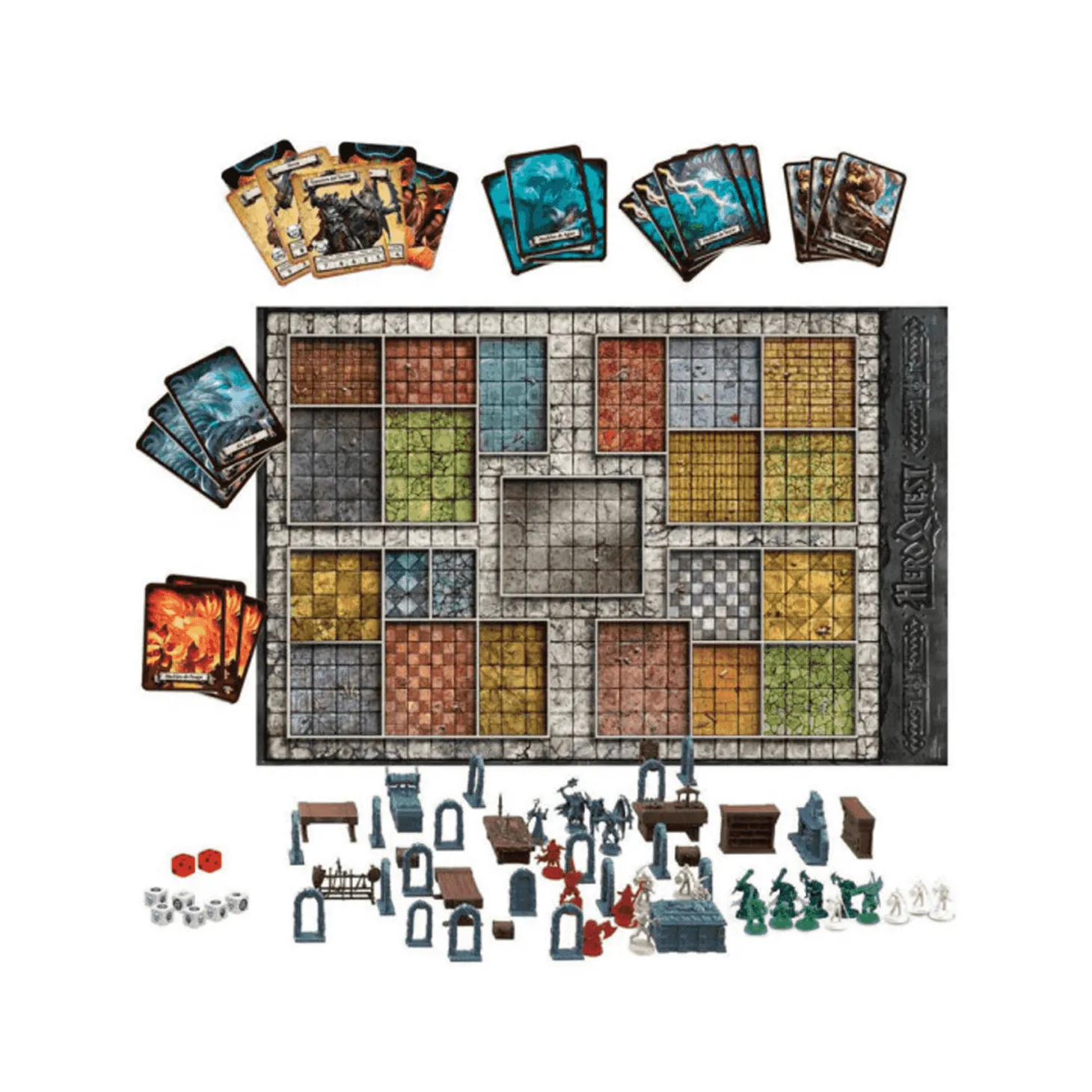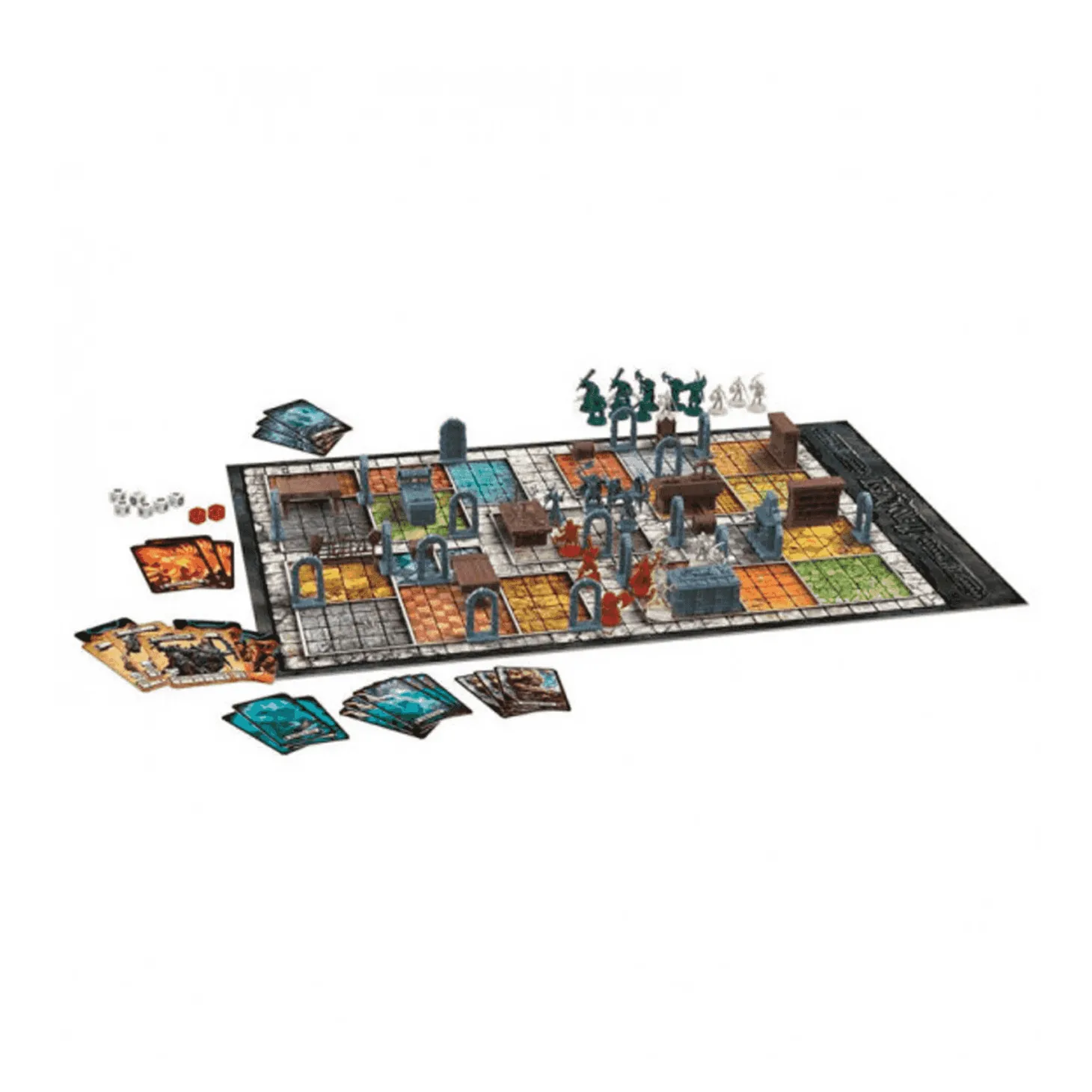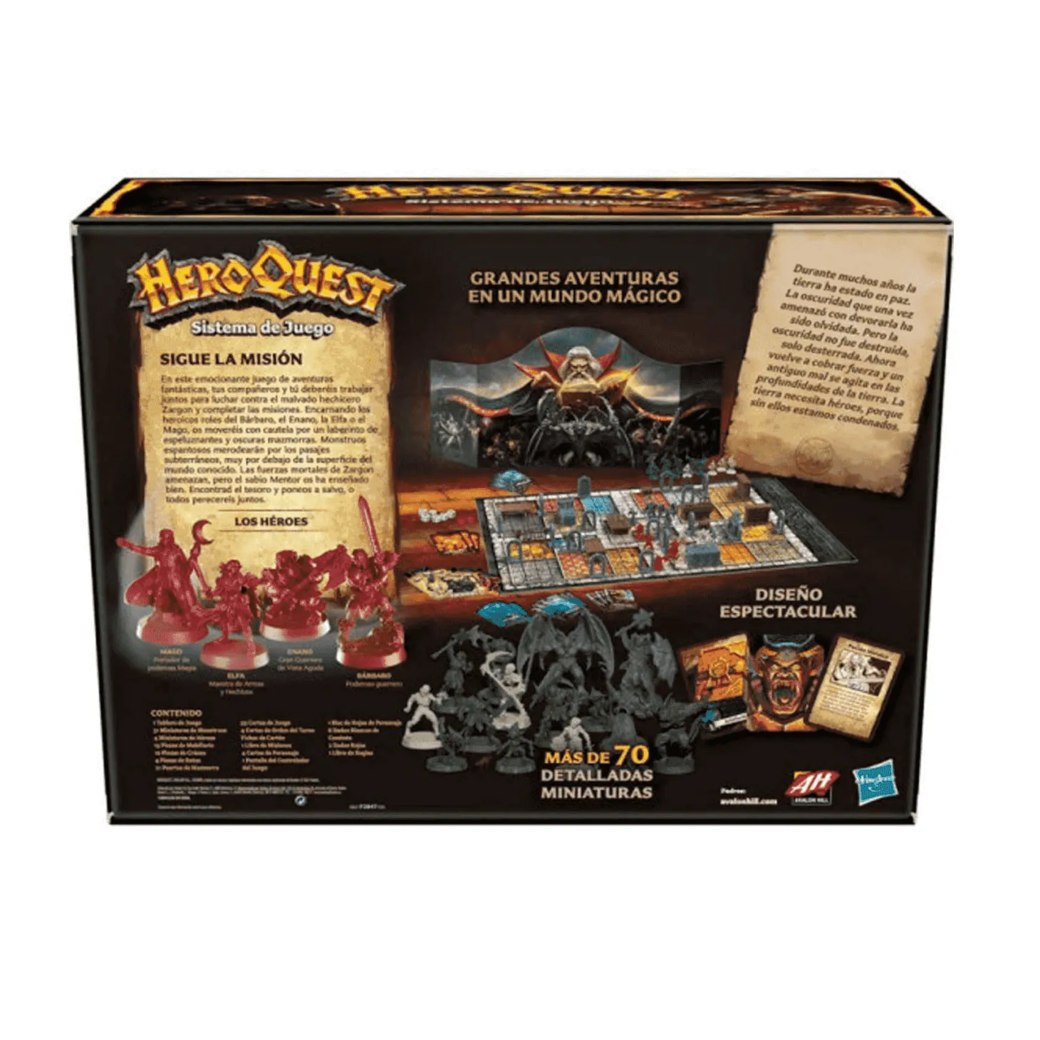 Contenido del juego: Incluye: tablero de juego, 31 miniaturas de monstruos, 4 miniaturas de héroes, 15 piezas de muebles, 10 piezas de calavera, 4 piezas de ratas de plástico, 21 puertas de mazmorra, 93 tarjetas de juego, 4 tarjetas de pedidos, azulejos de cartón, libro de búsqueda, 4 tarjetas de personajes, pantalla de Game Master, bloc de dados blancos de combate blancos, 2 dados rojos y libro de reglas.