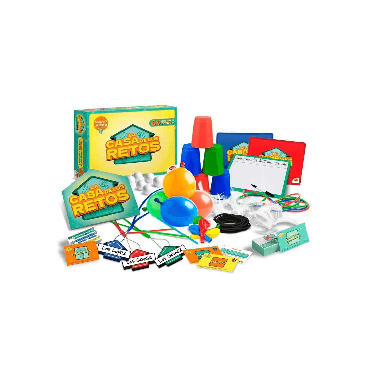¡Lleva la diversión del programa de televisión a tu hogar con La Casa de los Retos Nuevos Juegos! Esta nueva edición incluye 36 emocionantes retos y más de 50 preguntas para poner a prueba a toda la familia. Con cartas de bloqueo, elementos como plumas, pajitas, pelotas y globos, este juego garantiza horas de entretenimiento mientras replicáis los desafíos más increíbles del show.