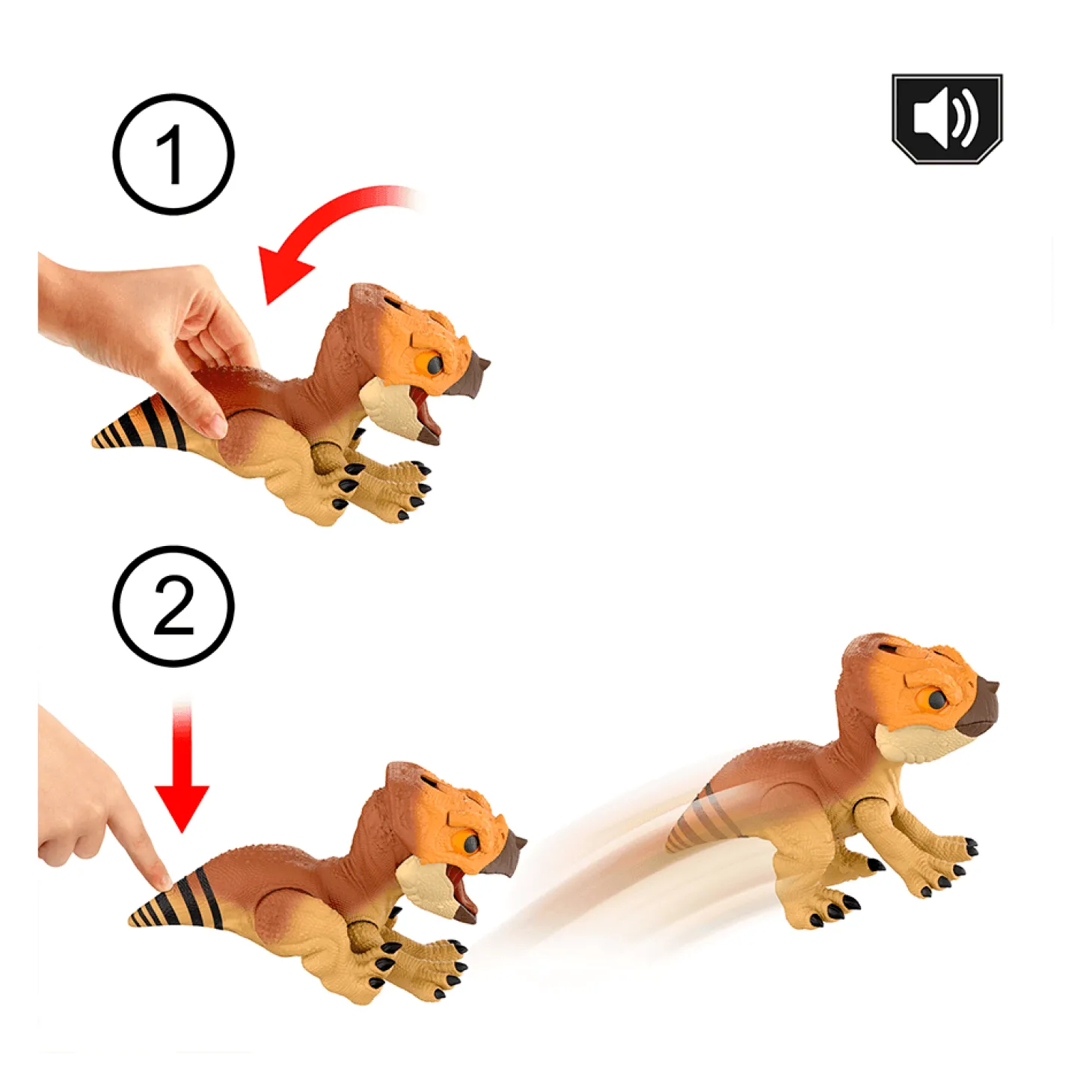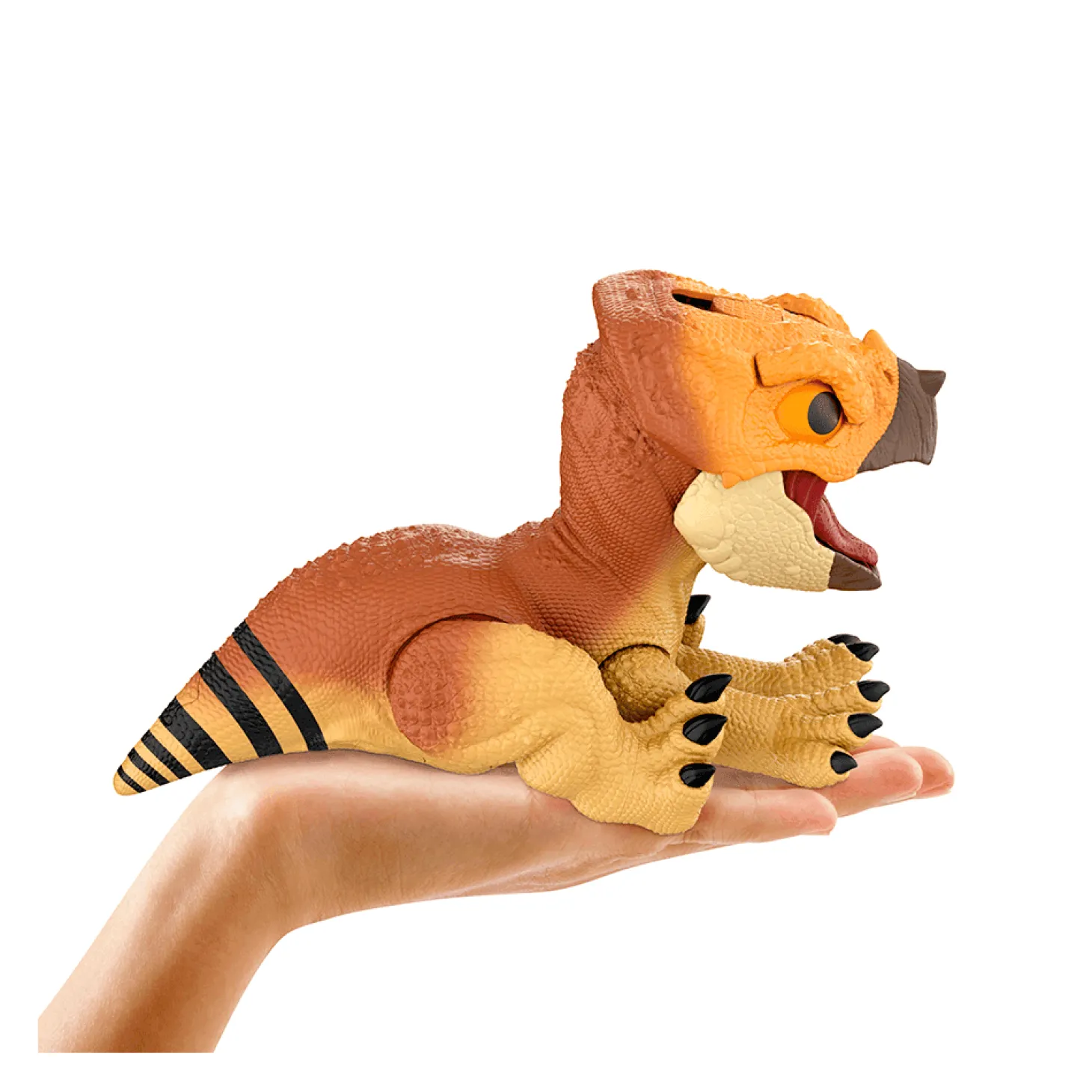 Incluye: Figura electrónica de dinosaurio Aquilops “Dolores” + accesorio de regaliz. Funciona con pila de botón (advertencia de seguridad incluida). Los colores y la decoración pueden variar.