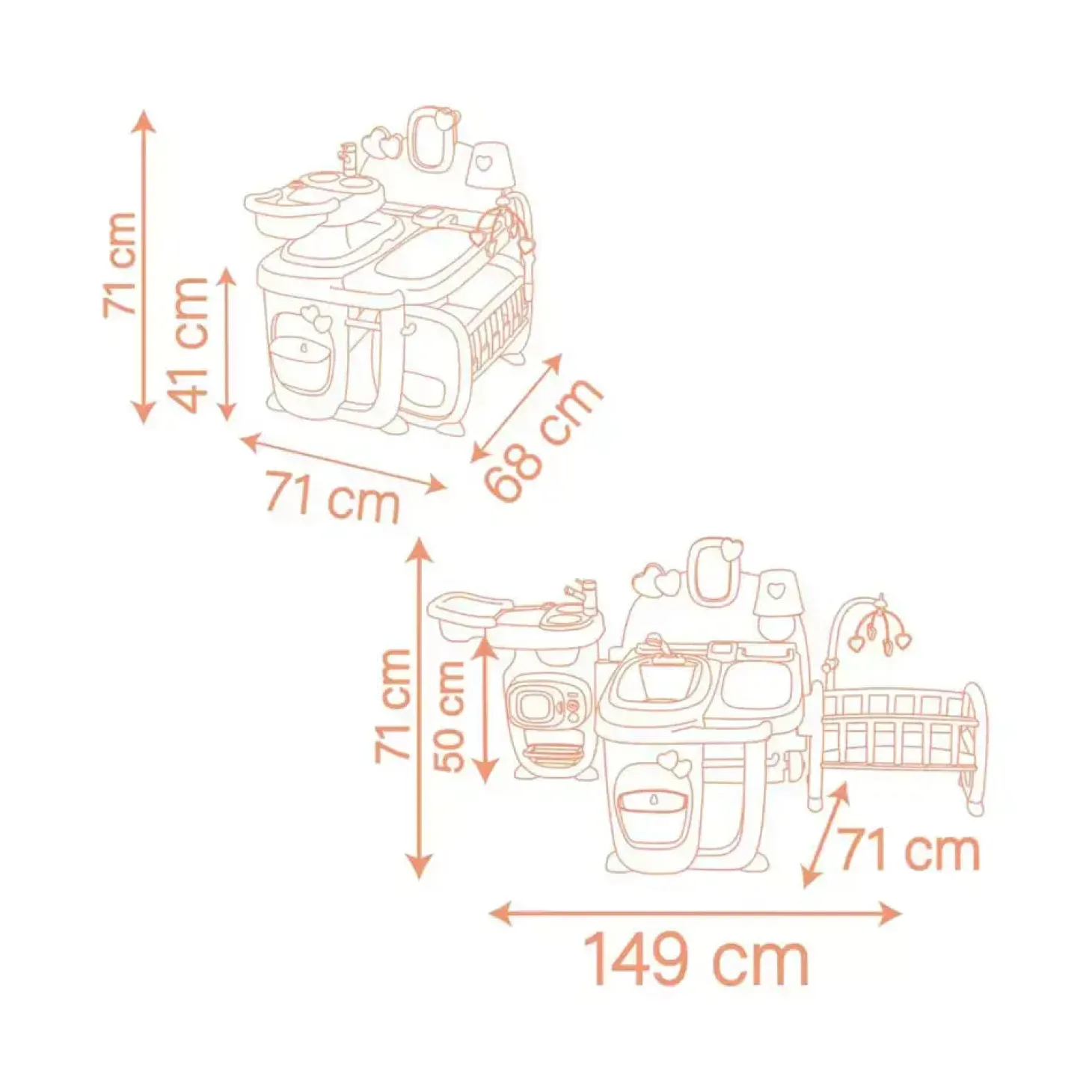 La Casa de los Bebés Baby Nurse de Smoby es un centro de juego plegable que integra cocina, baño y dormitorio para muñecos. Perfecta para recrear con detalles la rutina diaria de cuidado infantil y fomentar el juego imaginativo.