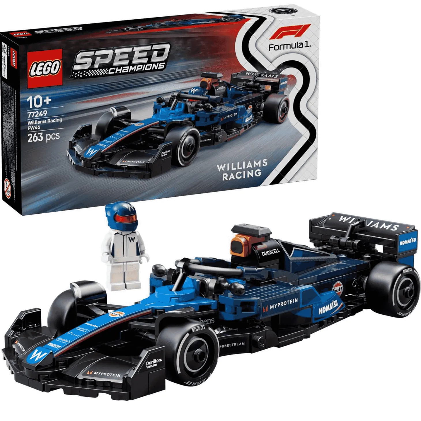 ¡El vehículo de juguete LEGO Speed Champions Coche de Carreras Williams Racing FW46 F1 (77249) reserva a niños y niñas a partir de 10 años la emoción trepidante de la Fórmula 1! Los peques y los coleccionistas de coches adultos pueden construir y exponer un coche de carreras de F1 que reproduce detalles de diseño del modelo que compitió en la temporada 2024 de Fórmula 1. Esta maqueta del F1 cuenta con habitáculo (al que accedes levantando el halo), alerón trasero, suspensión de doble horquilla, pegatinas de los patrocinadores y neumáticos traseros más anchos con la inscripción “Pirelli”. El coche de F1 construible viene con una minifigura de un piloto con traje de competición de Williams Racing y casco con alas. Los sets LEGO Speed Champions ofrecen a niños y aficionados al automovilismo la posibilidad de construir maquetas de algunos de los vehículos más icónicos del mundo, incluidos otros coches de F1 (a la venta por separado) participantes en la temporada 2024 del campeonato.