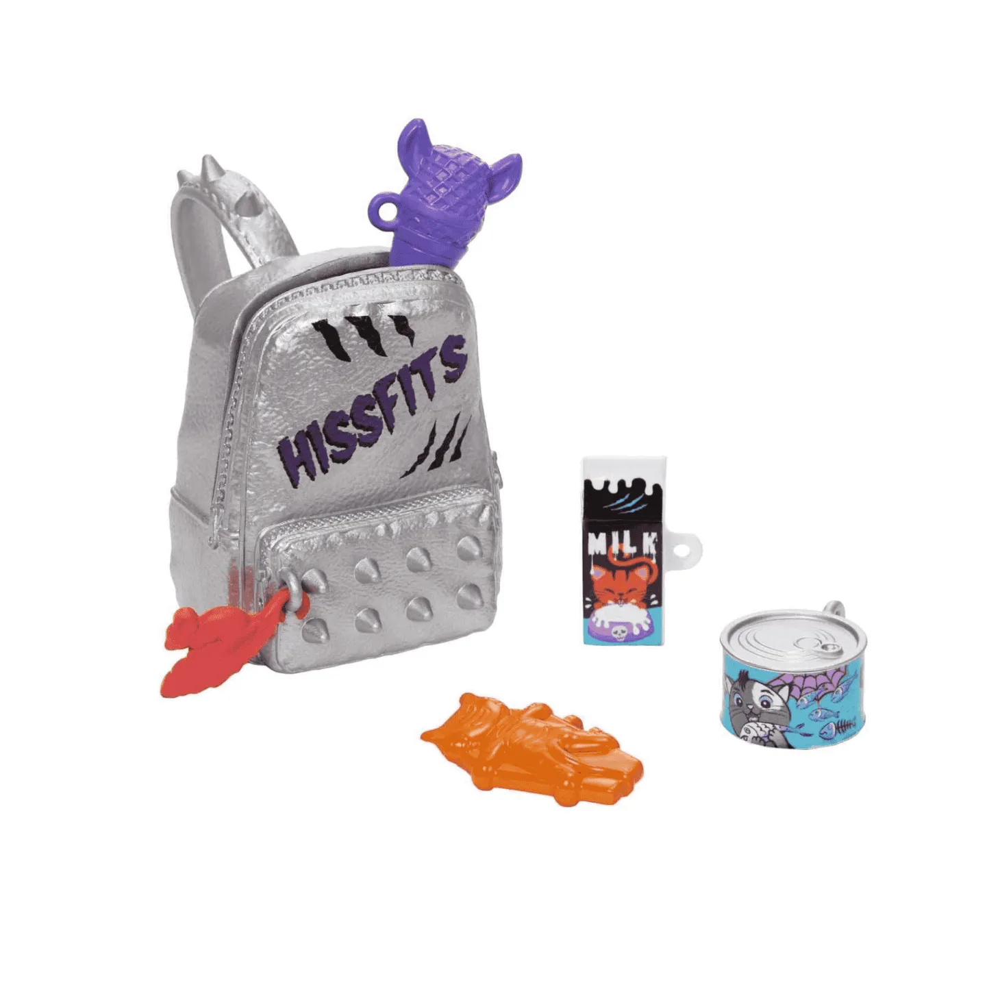 - Accesorios Incluidos: Viene con una camiseta de ´Hissfits´, una mochila metálica de ´Hissfits´, leche y comida para gatitos, un smartphone y su mascota tigre dientes de sable, Sweet Fangs.