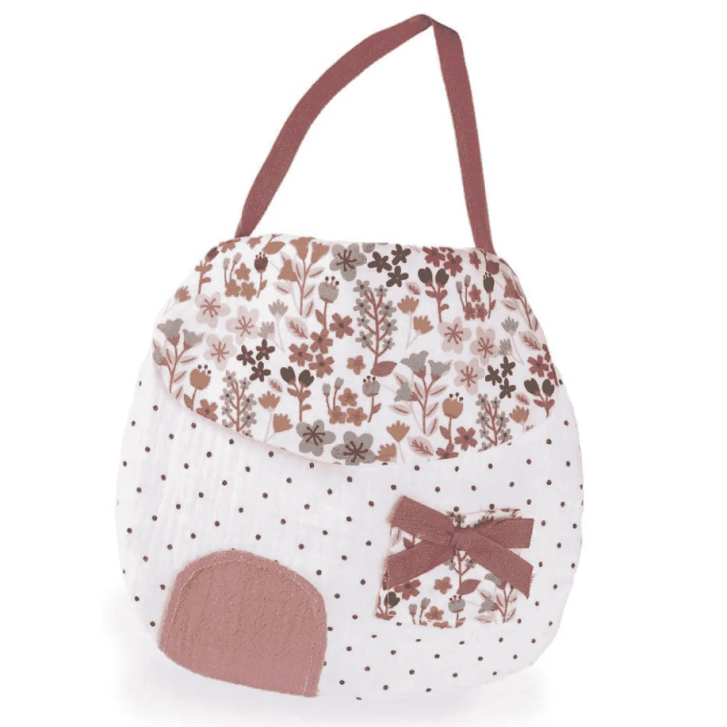 Berta mide 52 cm y tiene un cuerpo de tela blandito que invita a abrazarla. Viene vestida con un precioso vestido floral a juego con su diadema, y además, incluye una bolsita en forma de casita, ideal para llevar sus accesorios cuando salgas de paseo con ella.
