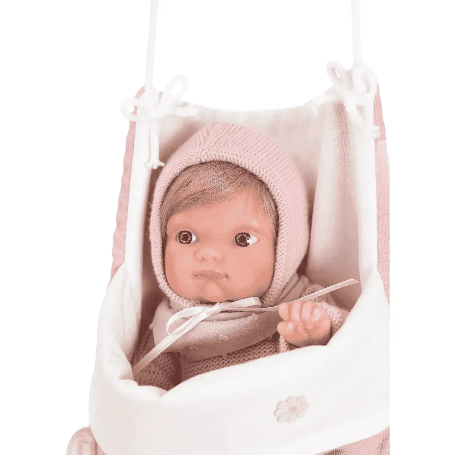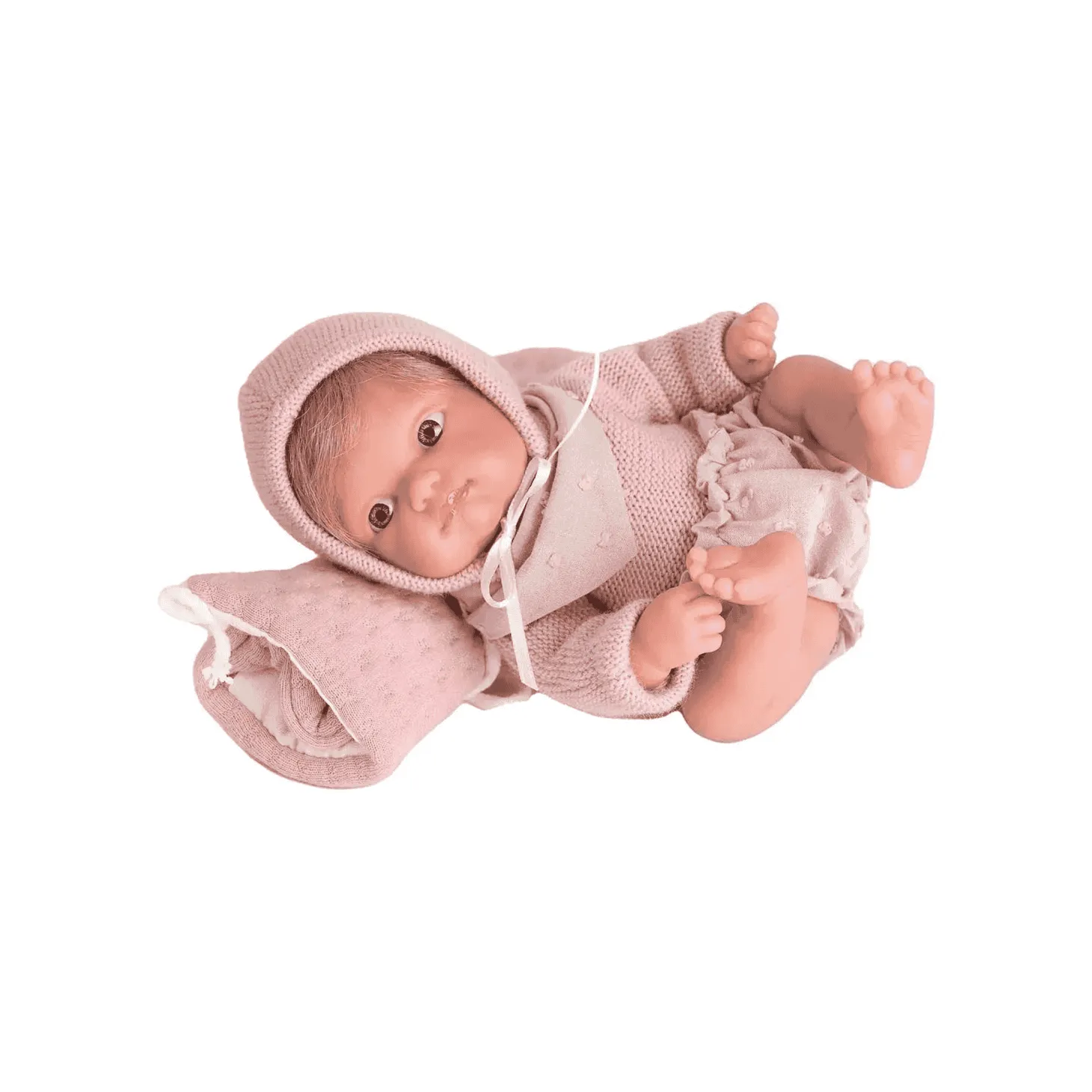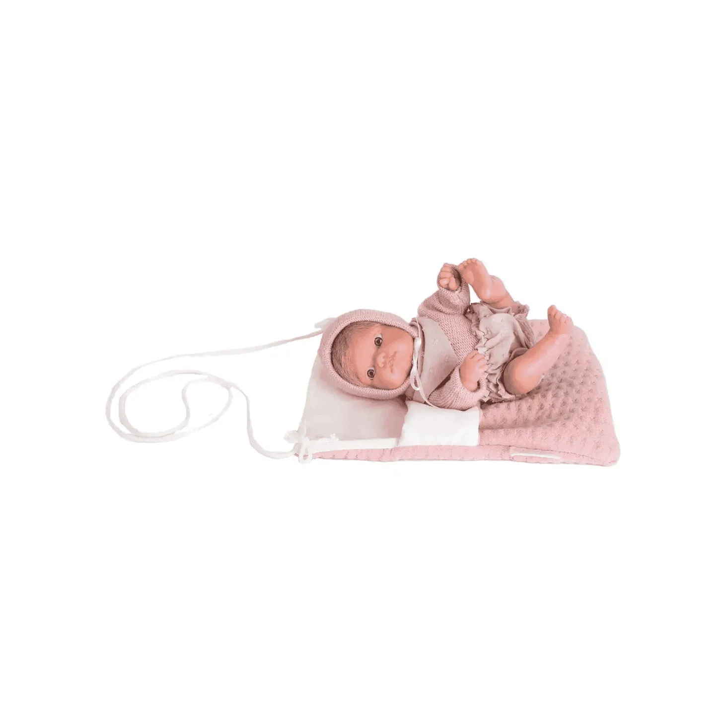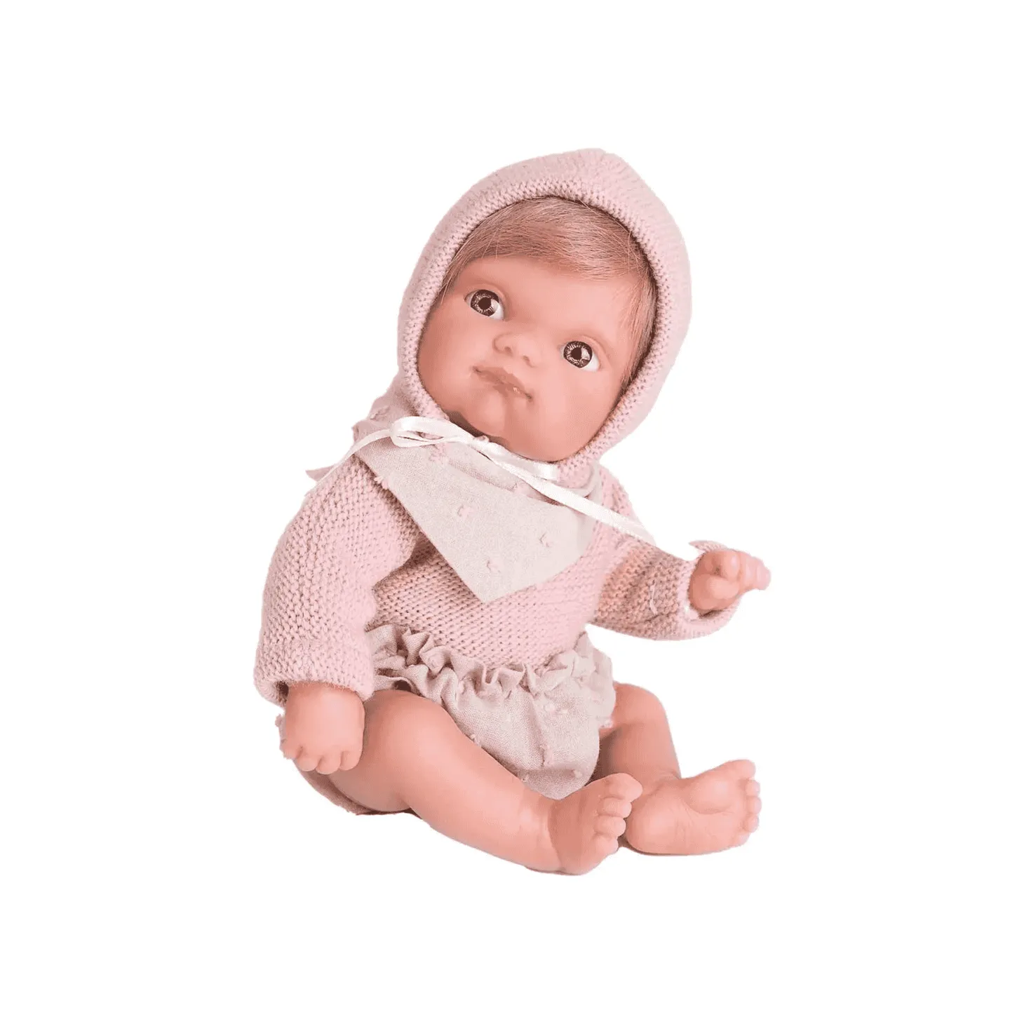 - Vestimenta Detallada: La muñeca viene vestida con un bonito jersey, culotte y babero a juego, complementados con un gorro que resalta su dulzura.