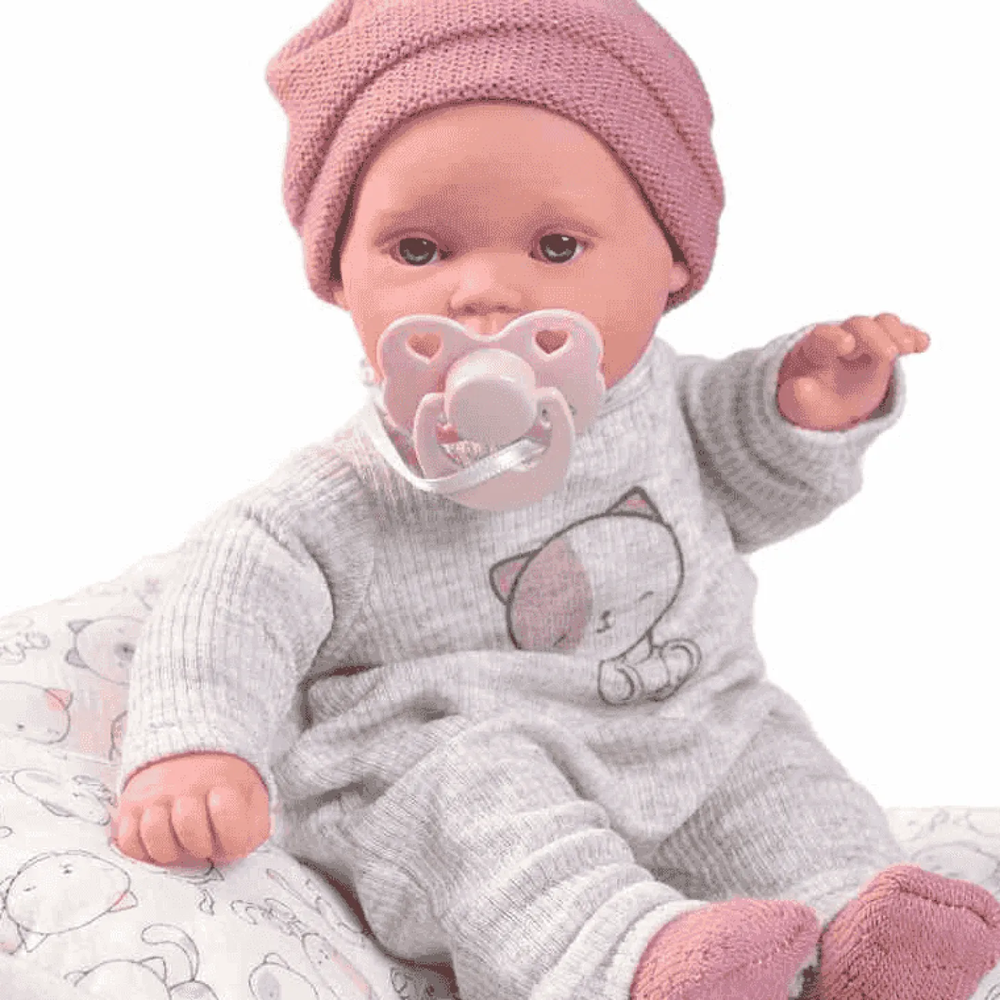 A Kika le encantan los gatitos, por eso su cojín y colchón tienen un estampado adorable inspirado en sus mascotas favoritas. Con su pijama y gorrito a juego, es imposible resistirse a su carita dulce y expresiva.