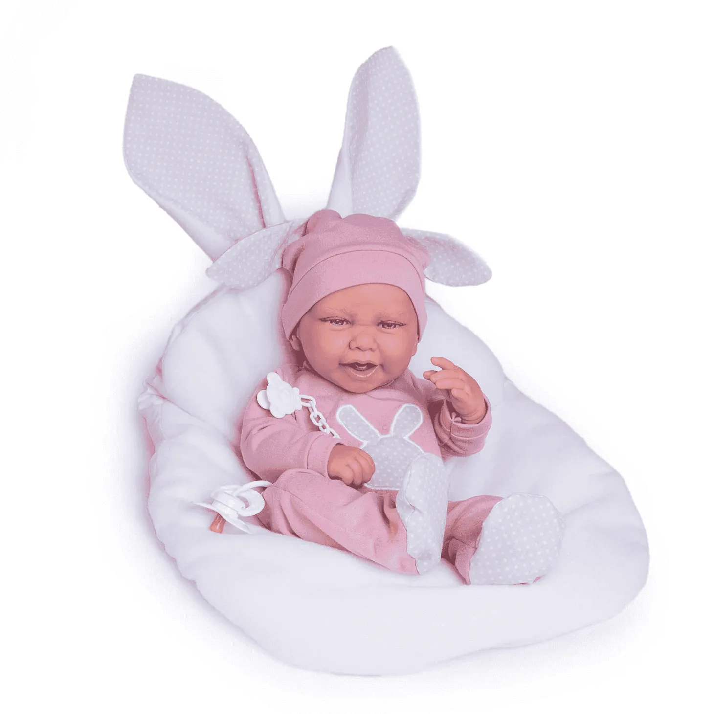 Carla es una encantadora muñeca bebé que disfruta de su suave cojín de descanso, diseñado para ayudarla a relajarse. Su pijama a juego con gorro de orejitas de conejo la hace aún más tierna y perfecta para jugar a la hora de dormir.