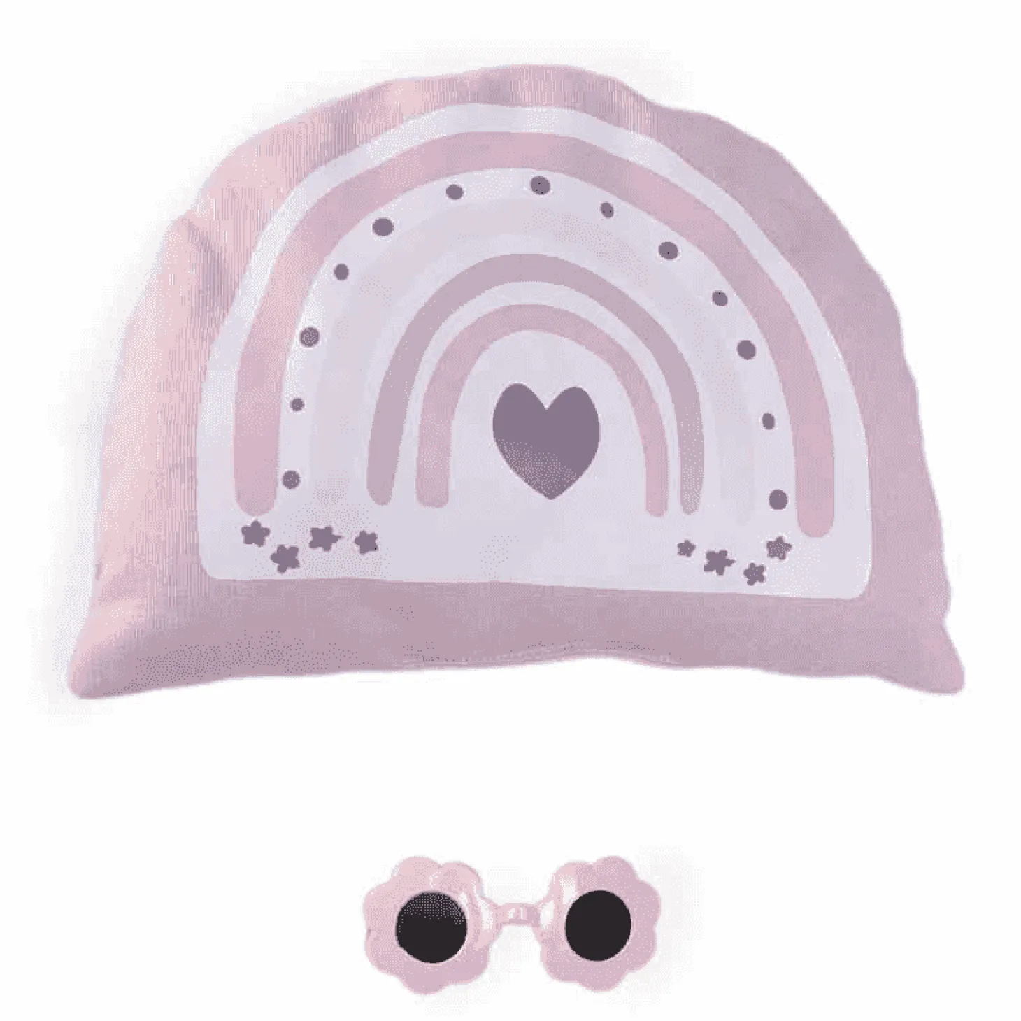 - Vestimenta Divertida: Luce un encantador pelele con dibujos de arcoíris y un gorro a juego que le da un toque travieso y adorable.