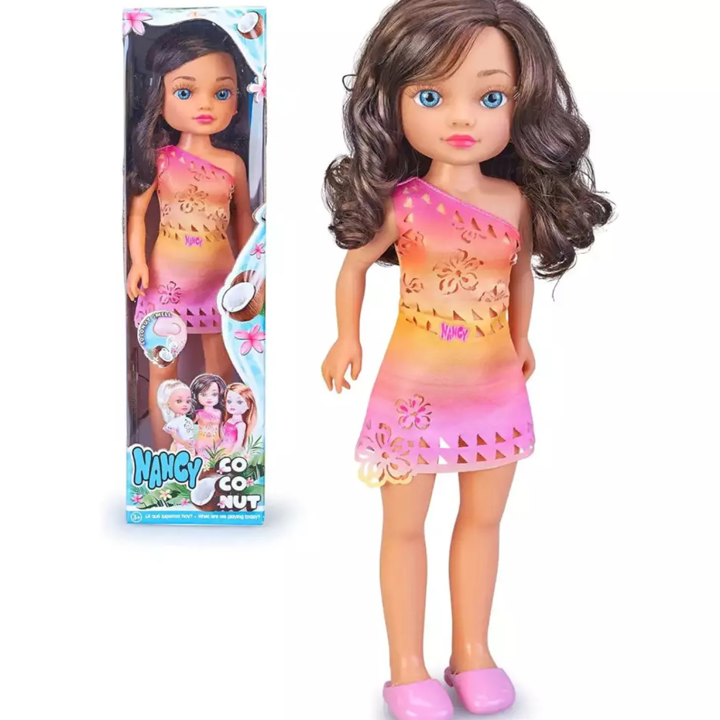La Nancy Coconut es una muñeca que evoca vacaciones y verano con solo mirarla. La versión Morena tiene piel bronceada, ojos azules brillantes y un vestido con aperturas modernas, ideal para aventuras bajo el sol. Además, huele a coco, ¡un detalle sensorial que hace el juego más real! Algunos modelos vienen surtidos (morena, rubia, pelirroja) y se envían al azar según existencias.