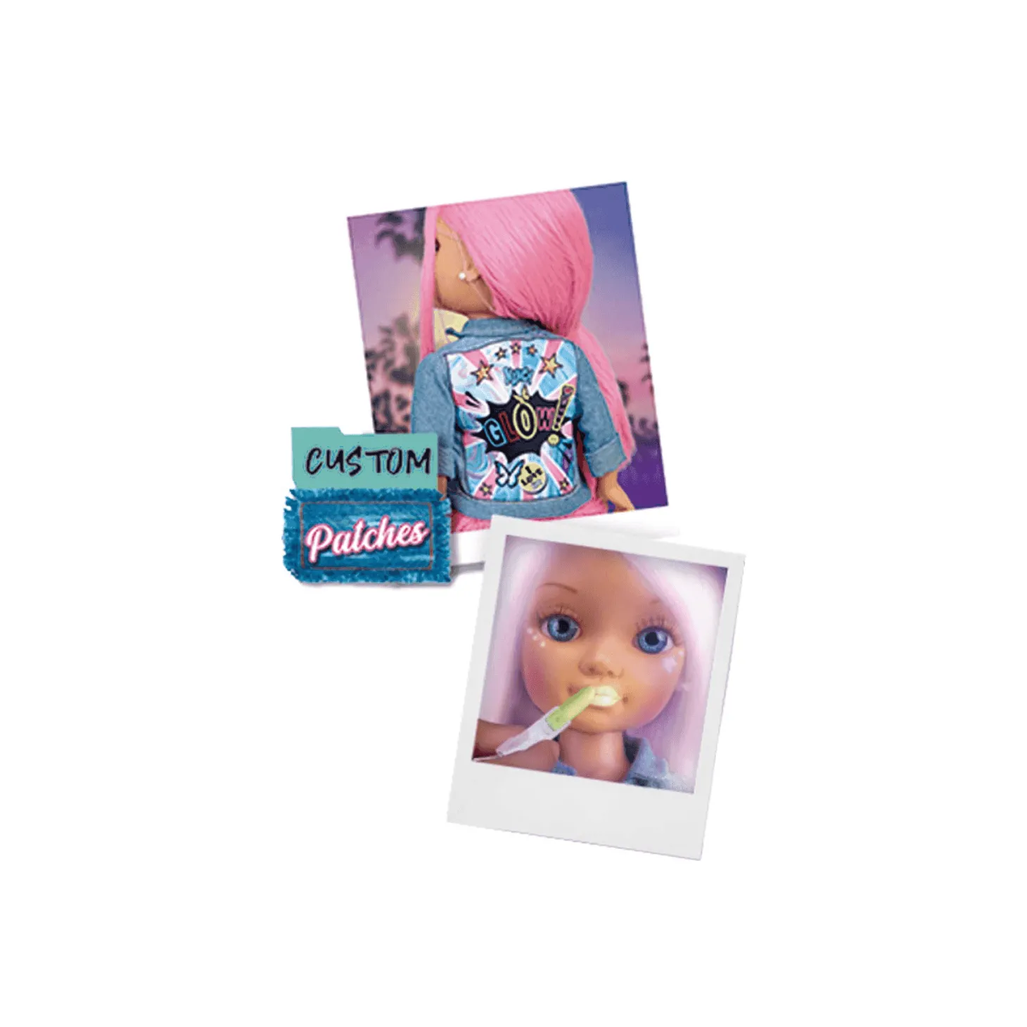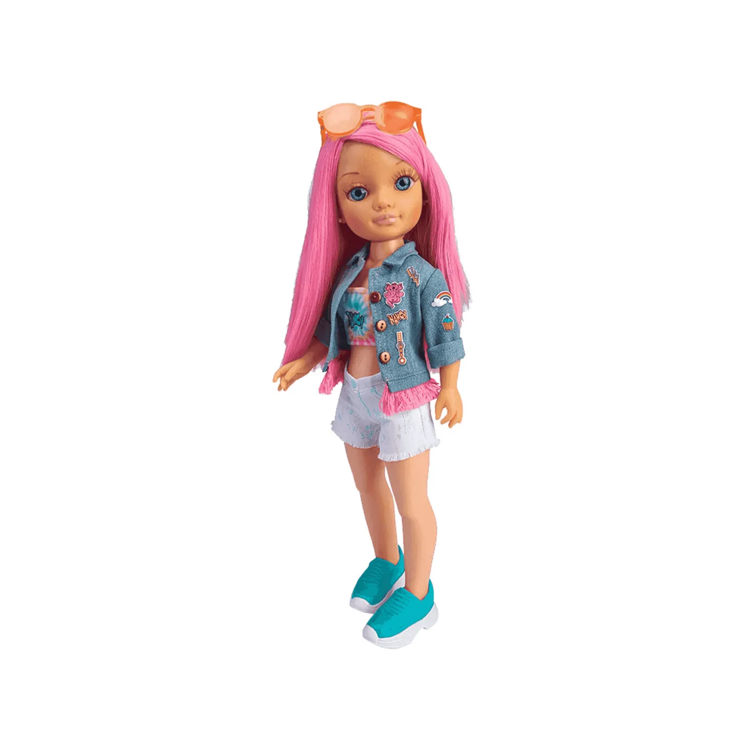 Nancy lleva una chaqueta vaquera de moda que se puede personalizar con los varios parches que se incluyen, ¡para hacer muchos looks! Y accesorios de moda: crop top, shorts, sneakers y gafas de sol.
