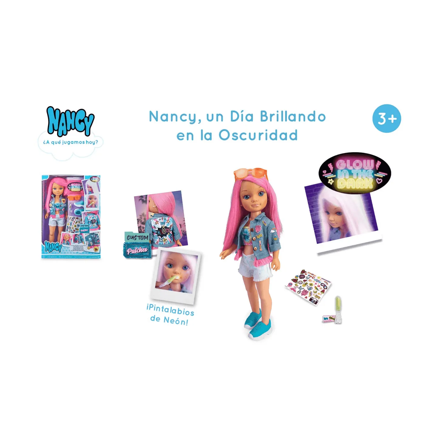 La muñeca más querida de España: Nancy, llega ahora un día brillando en la oscuridad para resaltar su hermosura y su particular manera de hacerse sentir. Imagínate con tus niños y niñas jugando con ella, viviendo fascinantes aventuras y disfrutando de todas las maravillosas ocurrencias que ofrece para vivir en familia.