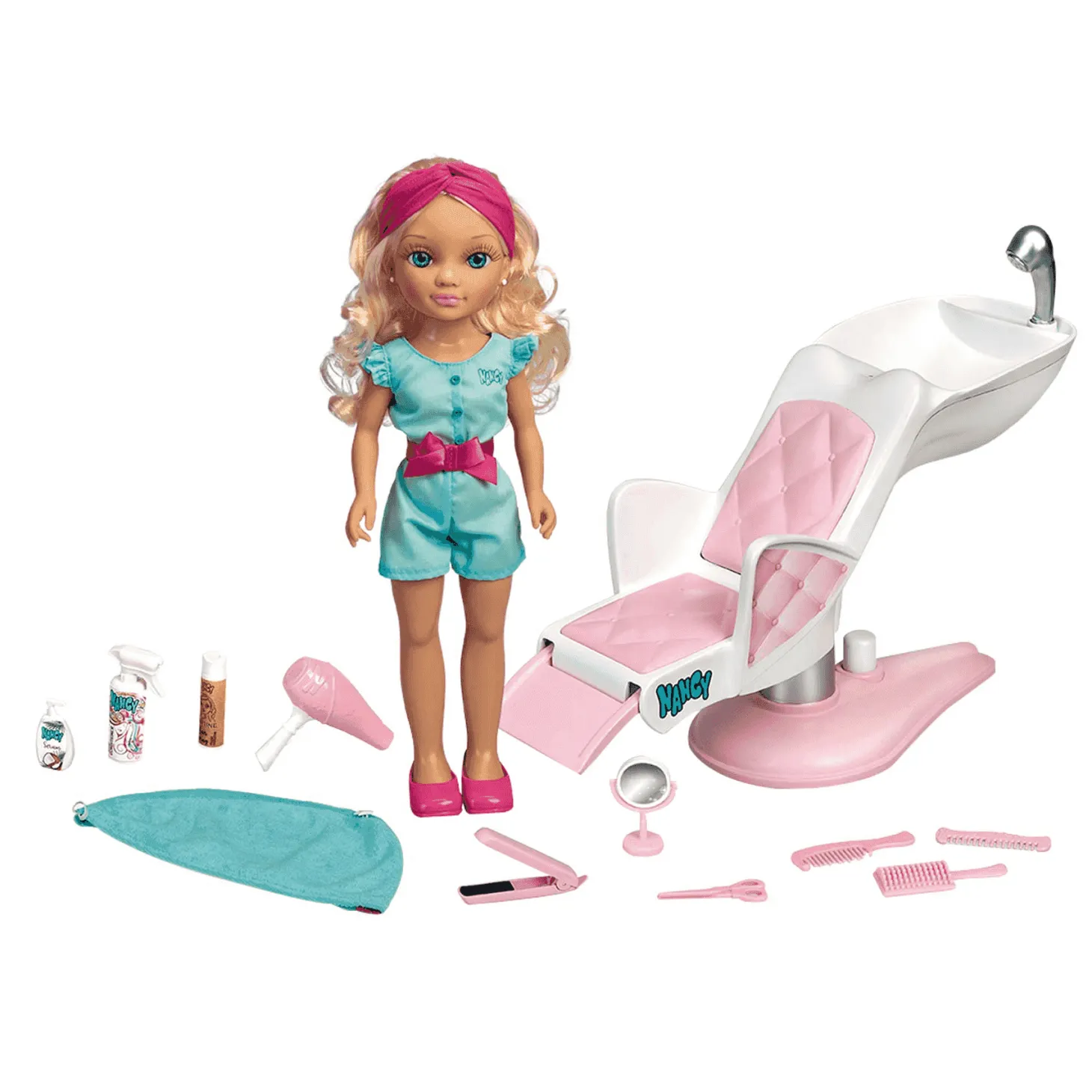La muñeca Nancy incluye más de 10 accesorios: 1 sillón reclinable con lavabo, 1 secador, 1 plancha, 2 modelos de peines, 1 cepillo, 1 tijera, 1 espejo, 1 paño para secar el cabello y 3 botes.