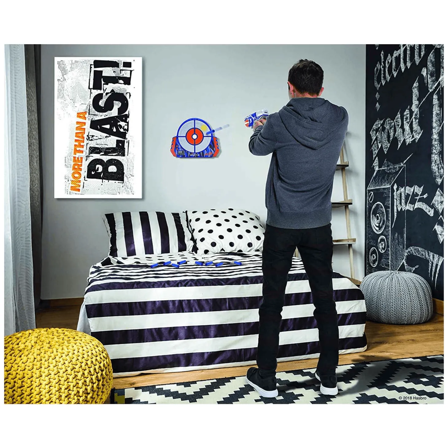 Esta diana electrónica Nerf se puede colgar en la pared de manera tradicional, pero también se puede dejar sobre una superficie estable ya que posee una base incorporada. La diana Nerf se usa para mejorar la puntería con los lanzadores y juguetes Nerf, posee tres formas de juego: puntos por conteo, puntos por precisión y disparos rápidos. La diana tiene tres puntajes que van de 10, 20 y 50 puntos, los cuales emiten sonidos diferentes cuando son golpeados por los dardos, de esta forma no puede haber trampas.