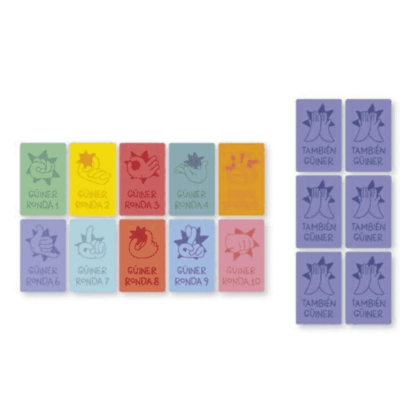 – 206 tarjetas: 189 de juego, 2 de instrucciones y 15 de ganador de ronda.