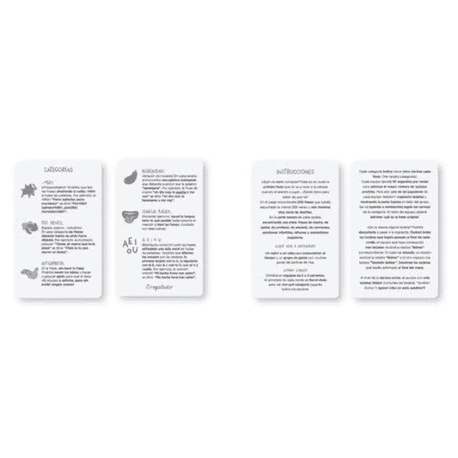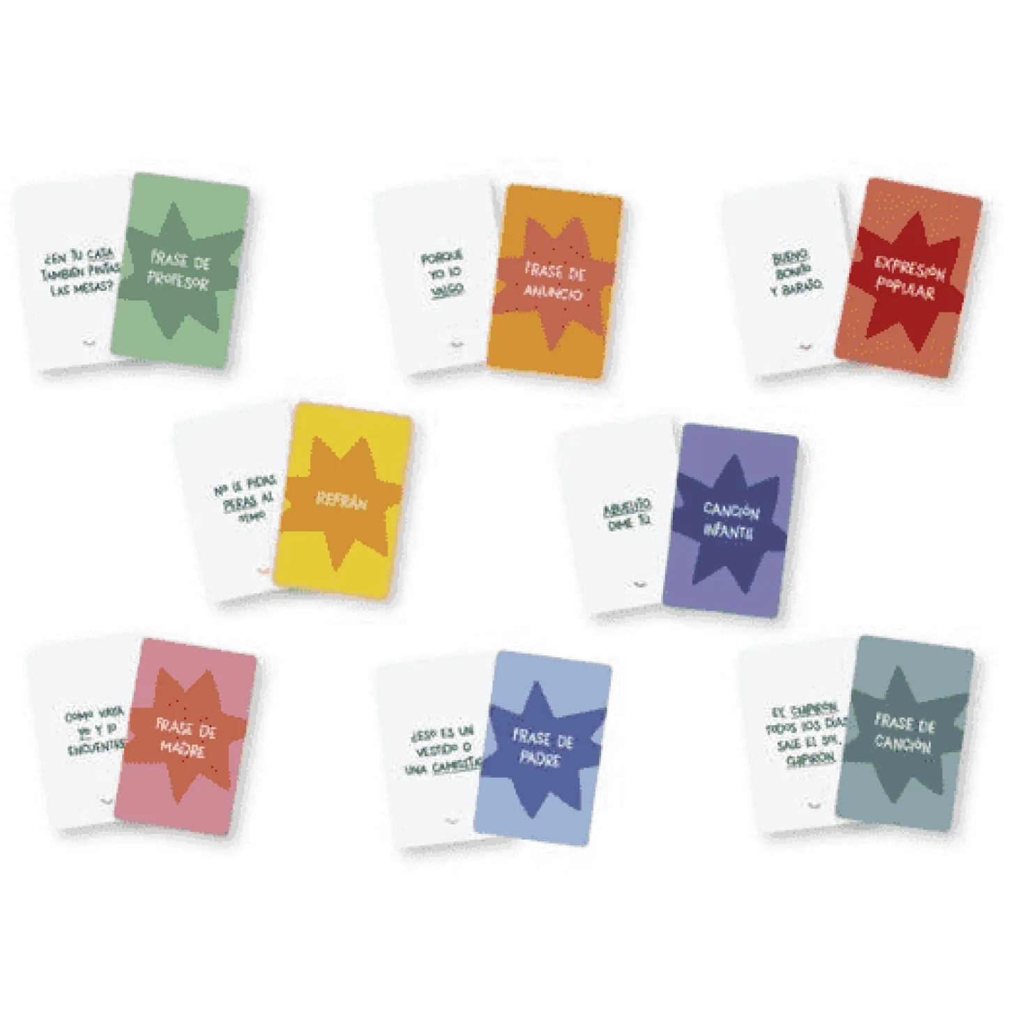 Es un juego de cartas interactivo donde los jugadores deben adivinar frases conocidas que son pronunciadas de maneras ridículas, como con la lengua fuera, solo utilizando la vocal ‘o’, o con finales absurdos. Ideal para grupos de 4 o más jugadores y con una duración aproximada de 30 minutos, es perfecto para animar cualquier velada.