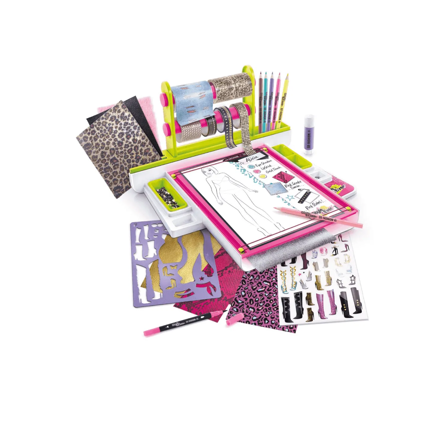 ¡Demuestra tu talento como estilista y crea tu colección con este Fashion Studio! Los numerosos accesorios incluidos te permitirán hacer muchos conjuntos fácilmente. Está equipado con todo lo que el diseñador necesita: plantillas, telas, papeles impresos, cintas, pegamentos, tijeras, lápices…