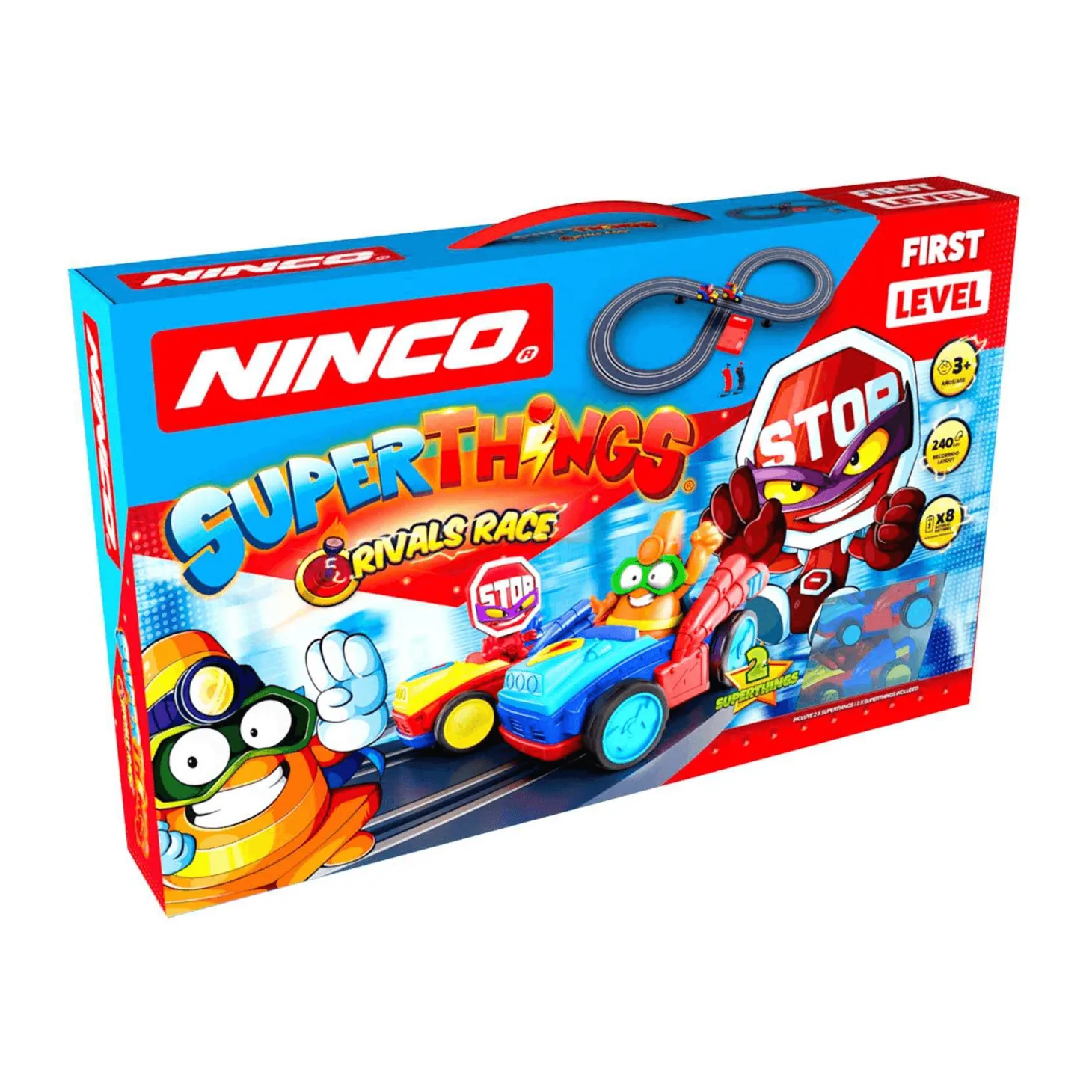 Este juguete incluye dos vehículos SPEED JUMPER y los personajes BARRY BLOCKER y KONE SAN. Puedes competir con tus Superthings favoritos porque los coches están adaptados a cualquier modelo de Superthings (se venden por separado) Funciona con 8 pilas AA y un transformador de energía.