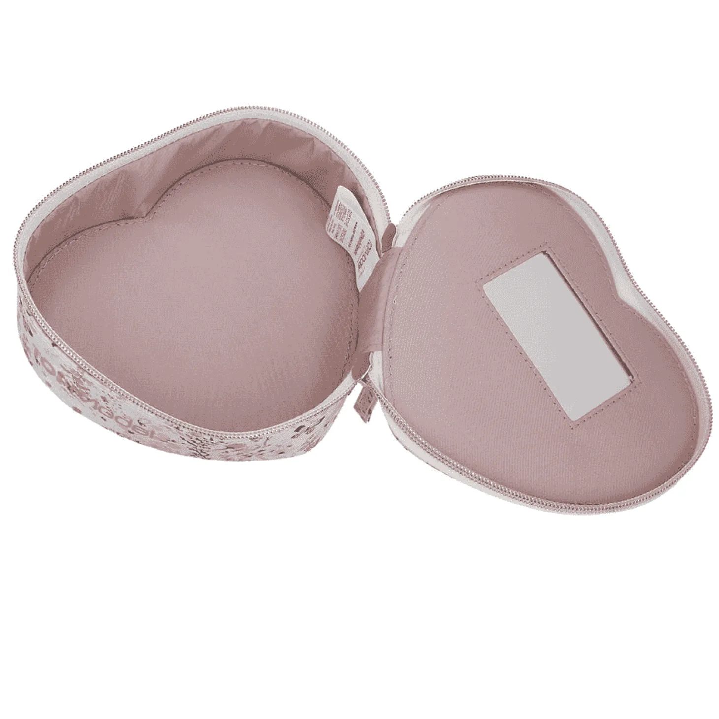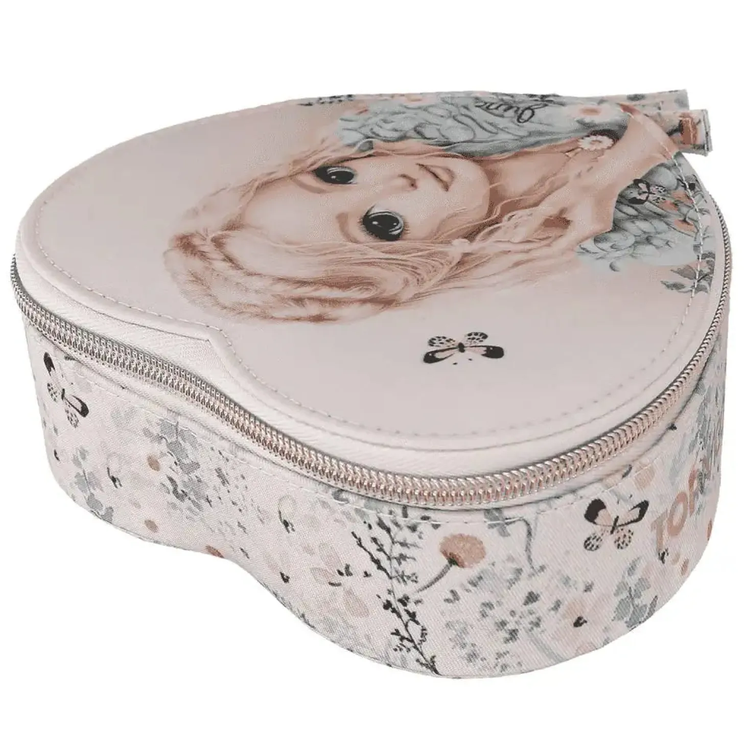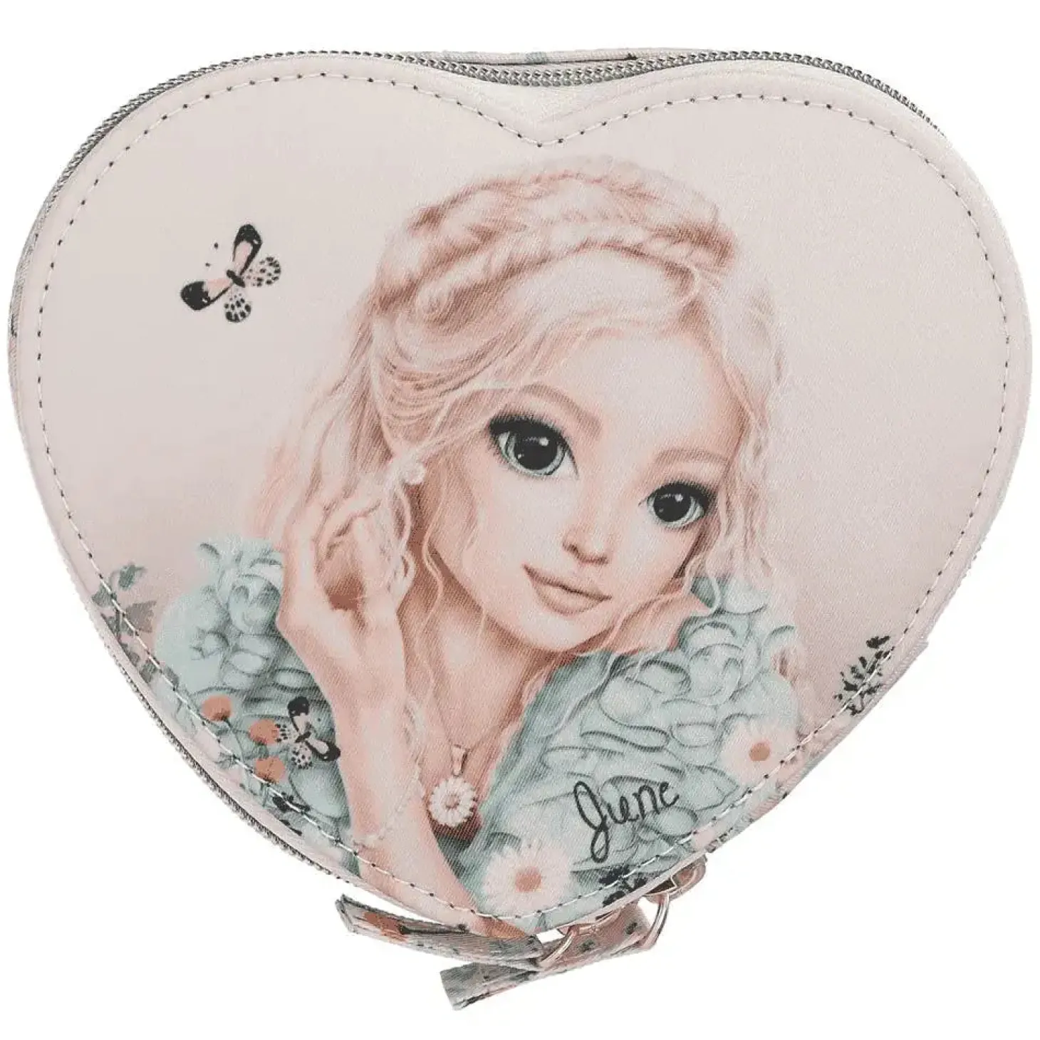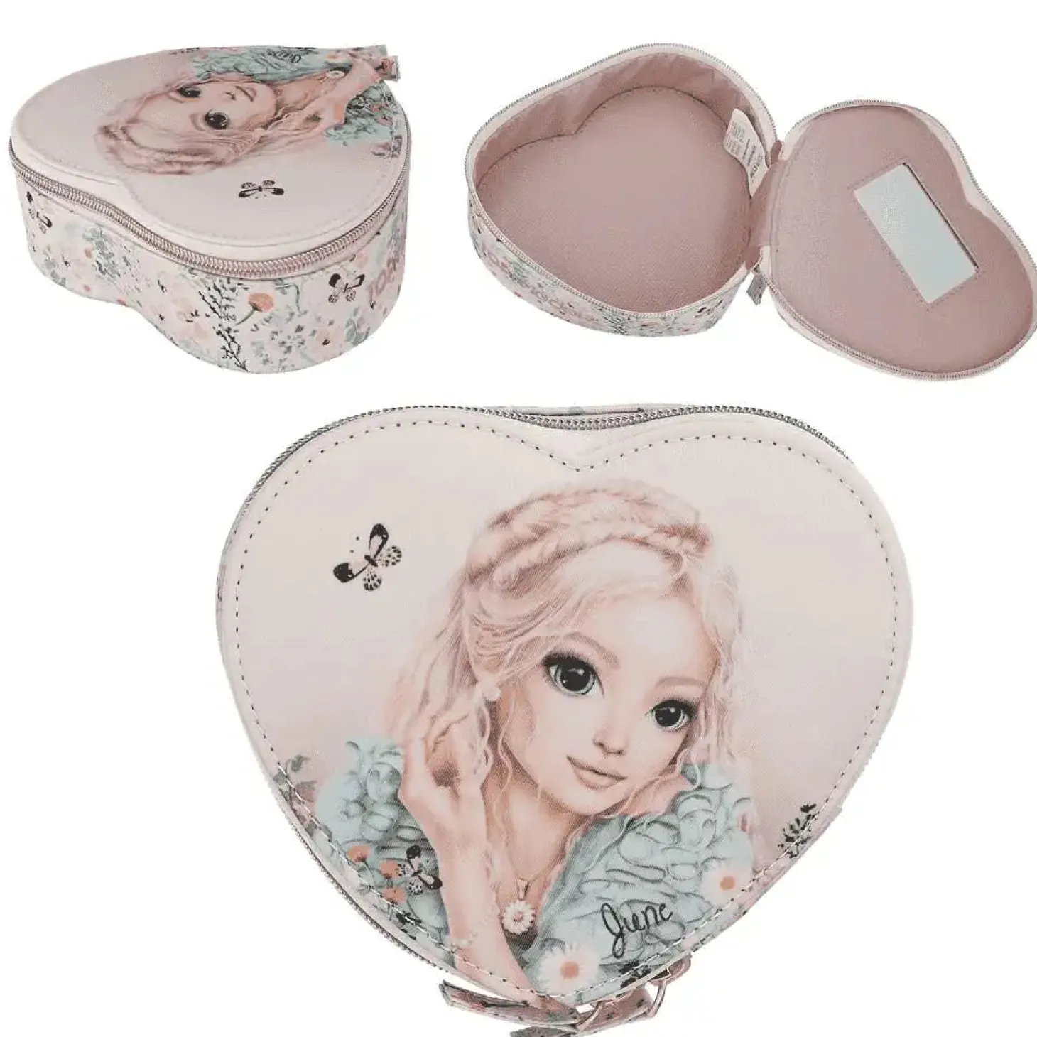Descripción del producto: La tapa de este joyerito de TOPModel con forma de corazón y cierre de cremallera está adornada con un romántico motivo de una modelo y los laterales llevan un monísimo estampado allover de delicadas flores y mariposas. El interior es rosa empolvado y lleva un espejo integrado en la tapa. Material: poliéster 100 por 100.