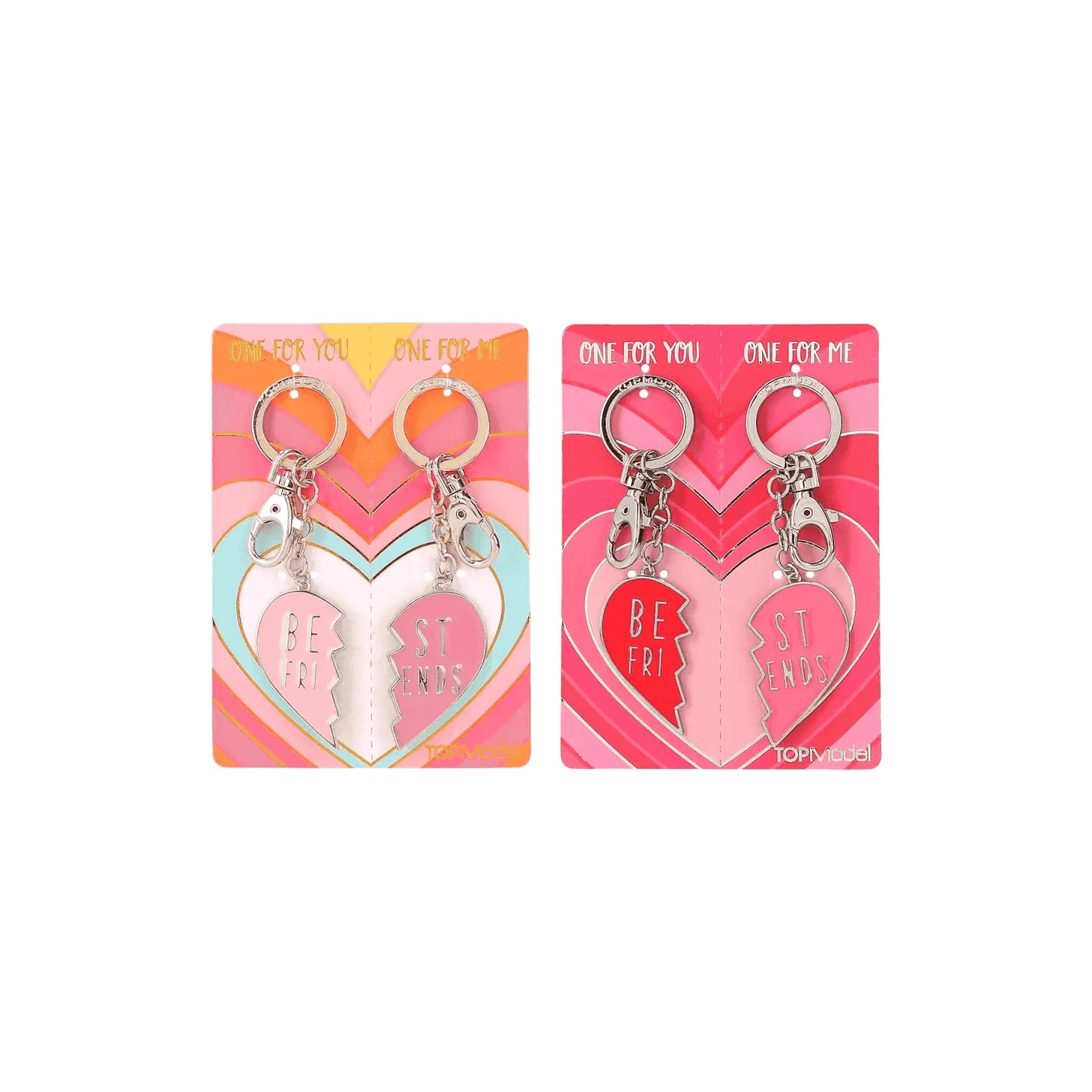 El llavero de TOPModel para las mejores amigas. Este encantador llavero es el regalo perfecto para compartir con tu mejor amiga. Cada juego consta de dos mitades de corazón que se unen para formar un único corazón completo, simbolizando la conexión especial entre dos amigas. Disponible en dos estilos: metal dorado o plateado, y en varios tonos de rojo y rosa para los corazones.