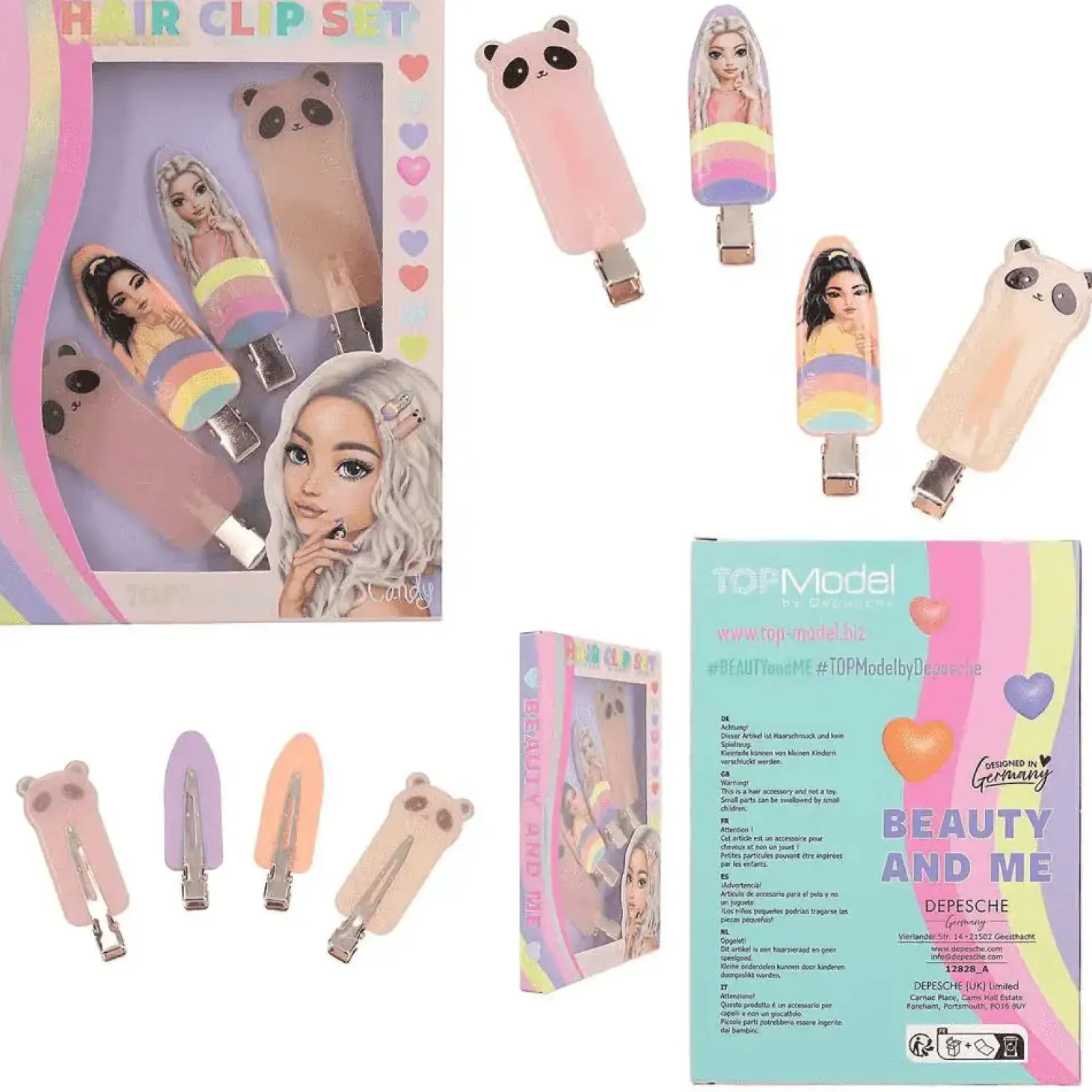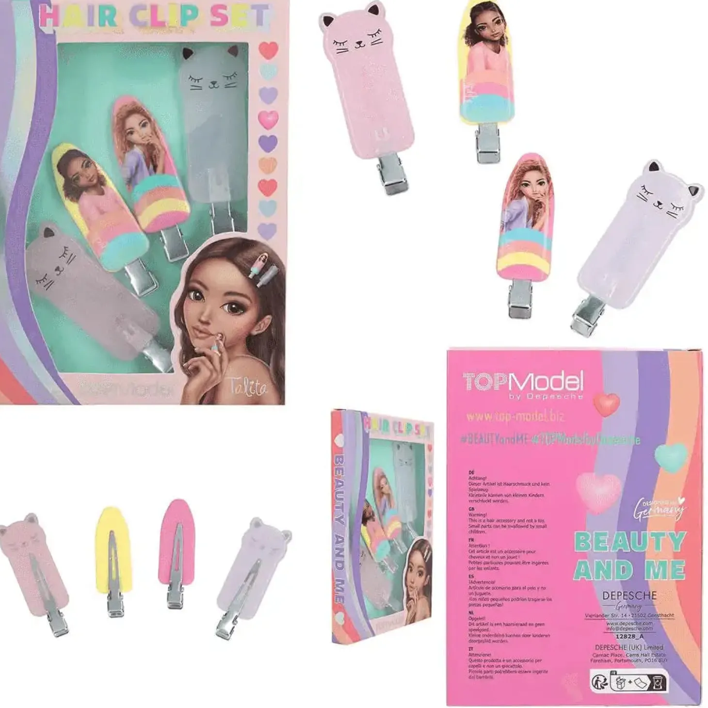 Descripción del producto: Cuatro para sujetar: Las hebillas de TOPModel fijan el cabello para que no se mueva. Disponibles 2 sets: 2 hebillas con modelos de TOPModel en lila y naranja, más 2 hebillas con diseño de panda de color albaricoque y rosa semitransparente con purpurina, todas con la parte metálica dorada. El otro set se compone de 2 hebillas con modelos de TOPModel en amarillo y fucsia, más 2 hebillas con diseño de gato de color blanco y rosa semitransparente con purpurina, todas con la parte metálica plateada.