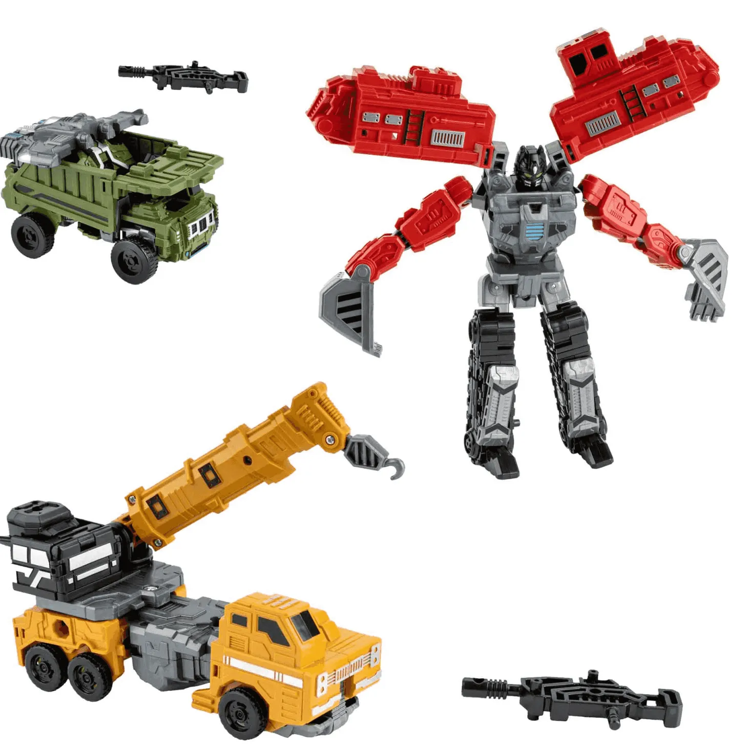 Lo asombroso de estos juguetes es que no solo son vehículos realistas de construcción, ¡sino que también se transforman en robots poderosos! Con solo unos sencillos pasos, puedes convertir cada vehículo en un formidable robot listo para la aventura y la batalla.